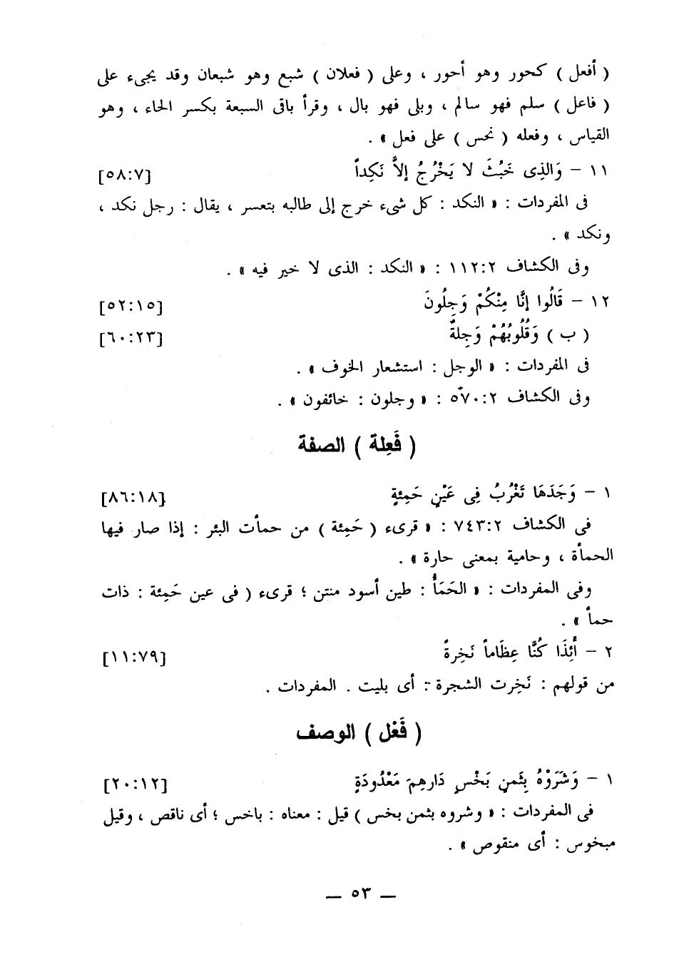 (أفعل) كحور وهو أحور، وعلى (فعلان) شبع وهو شبعان وقد يجئ على (فاعل) سلم فهو سالم، ويلي فهو بال، وقرأ باقي السبعة بكسر الحاء، وهو القياس، وفعله (نحس) على فعل».