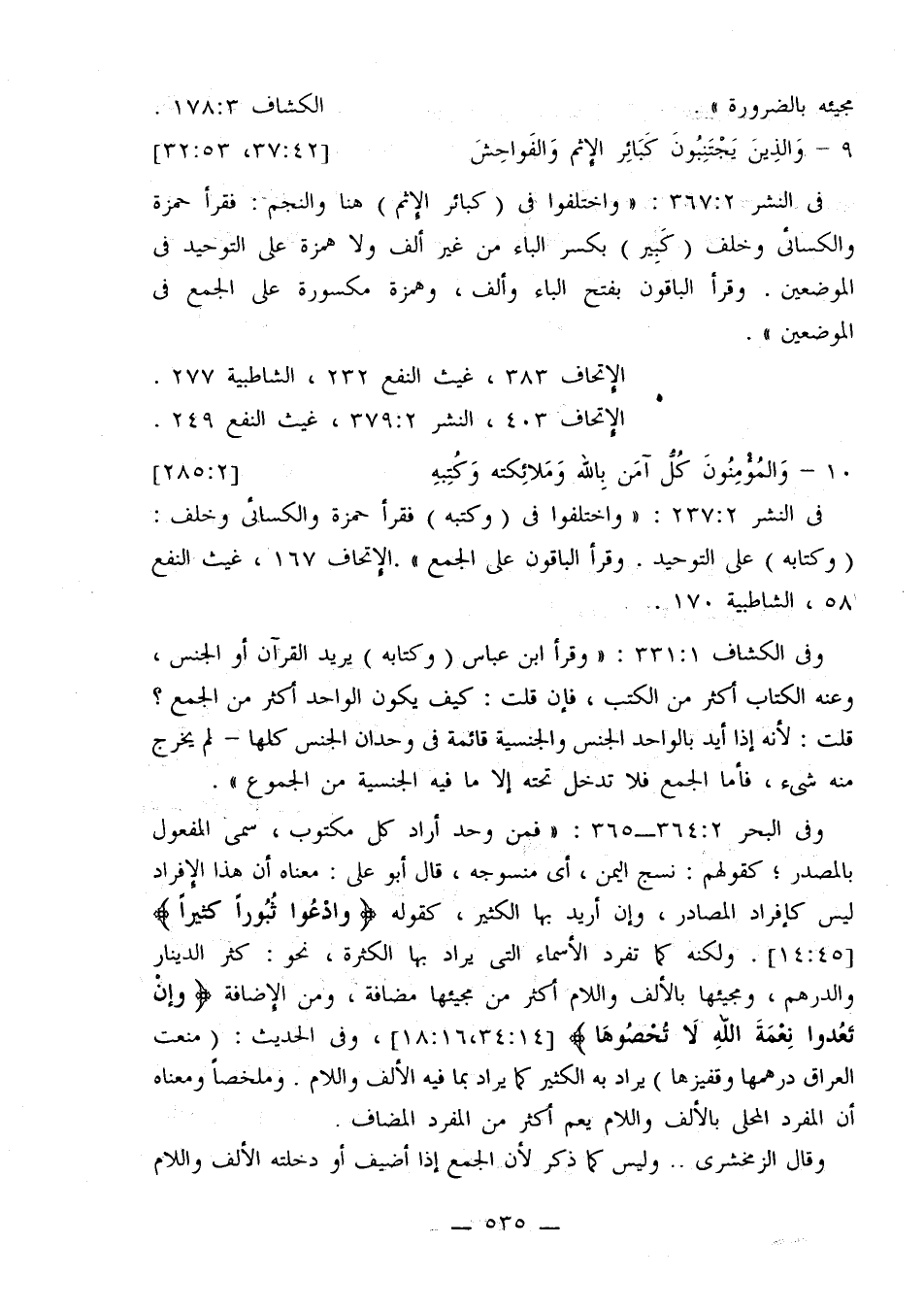 في النشر 2: 367: «واختلفوا في (كبائر الإثم) هنا والنجم: فقرأ حمزة والكسائي وخلف (كبير) بكسر الباء من غير ألف ولا همزة على التوحيد في الموضعين. وقرأ الباقون بتفح الباء وألف، وهمزة مكسورة على الجمع في الموضعين».