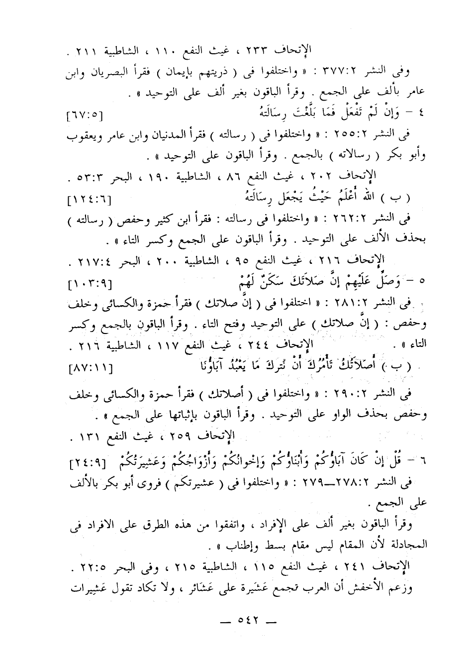 في النشر 2: 255: «واختلفوا في (رسالته) فقرأ المدنيان وابن عامر ويعقوب وأبو بكر (رسالاته) بالجمع. وقرأ الباقون على التوحيد».