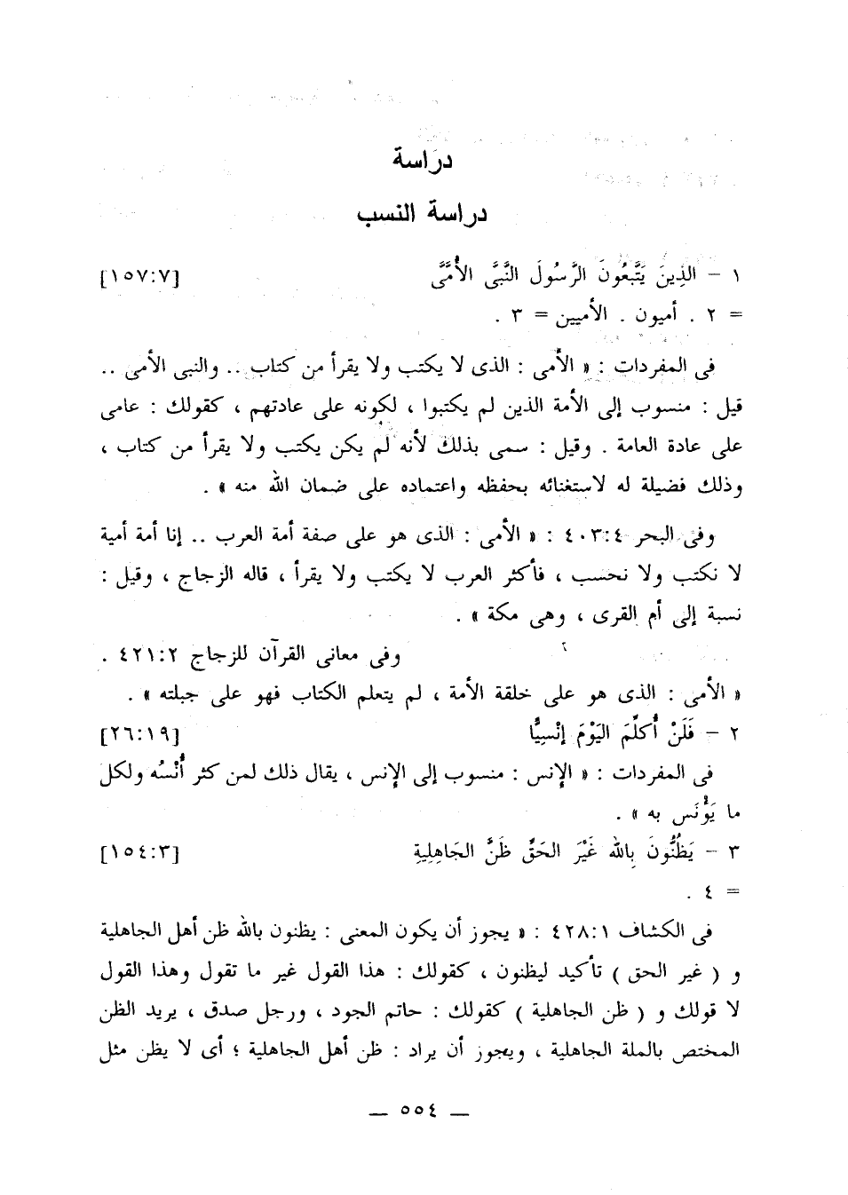وفي البحر 4: 403: «الأمي: الذي هو على صفة أمة العرب ... إنا أمة أمية لا نكتب ولا نحسب، فأكثر العرب لا يكتب ولا يقرأ، قال الزجاج، وقيل: نسبة إلى أم القرى، وهي مكة».