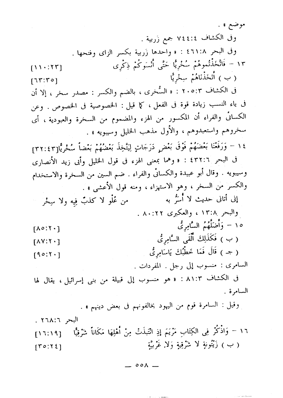 في الكشاف 3: 205: «السخرى، بالضم والكسر: مصدر سخر، إلا أن في ياء النسب زيادة قوة في الفعل، كما قيل: الخصوصية في الخصوص. وعن الكسائي والفراء أن المكسور من الهزء والمضموم من السخرة والعبودية، أي سخروهم واستعبدوهم، والأول مذهب الخليل وسيبويه».