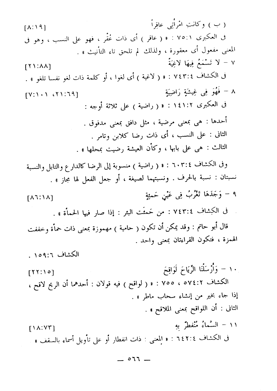 وفي الكشاف 4: 603: «(راضية) منسوبة إلى الرضا كالدارع والتابل والنسبة نسبتان: نسبة بالحرف. ونسبتهما لصيغة، أو جعل الفعل لها مجاز».