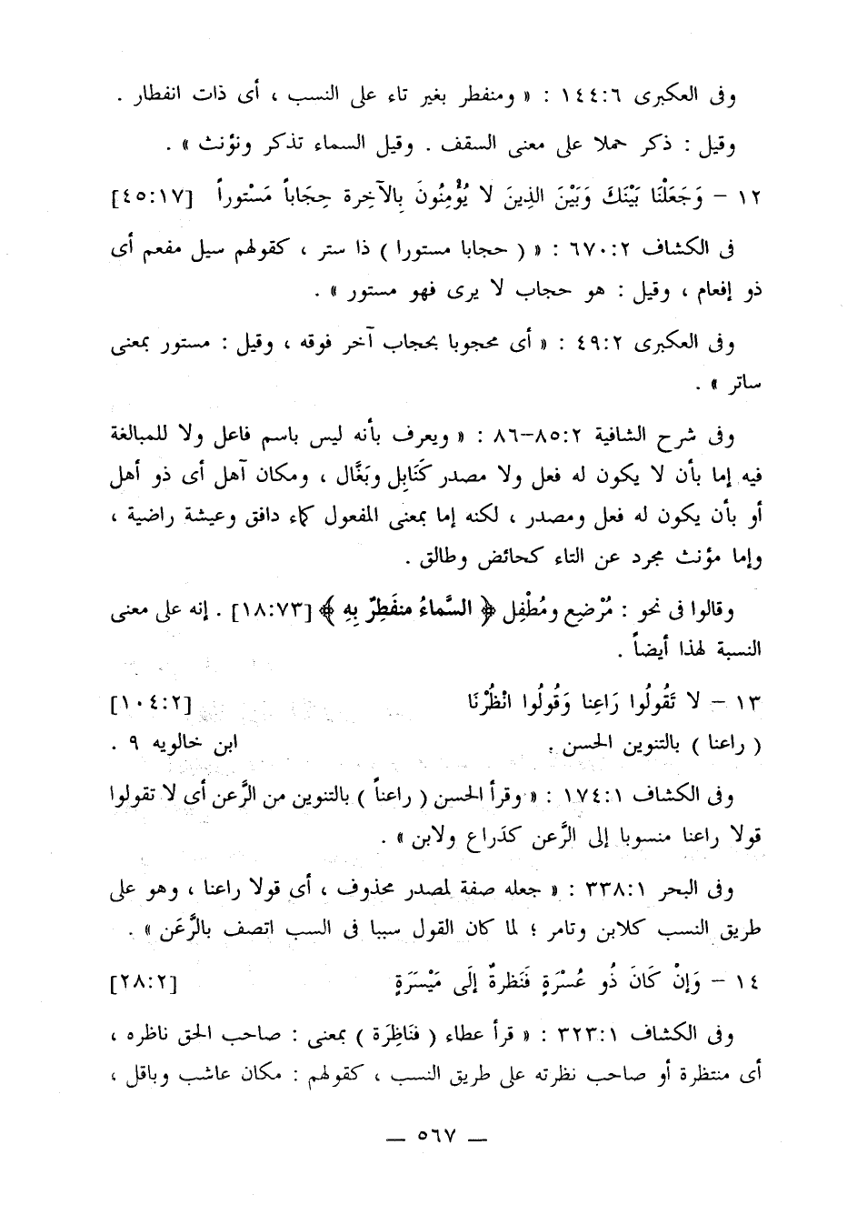 في الكشاف 2: 570: «(حجابا مستورا) ذا ستر، كقولهم سيل مفعم أي ذو إفعام، وقيل: هو حجاب لا يرى فهو مستور».
