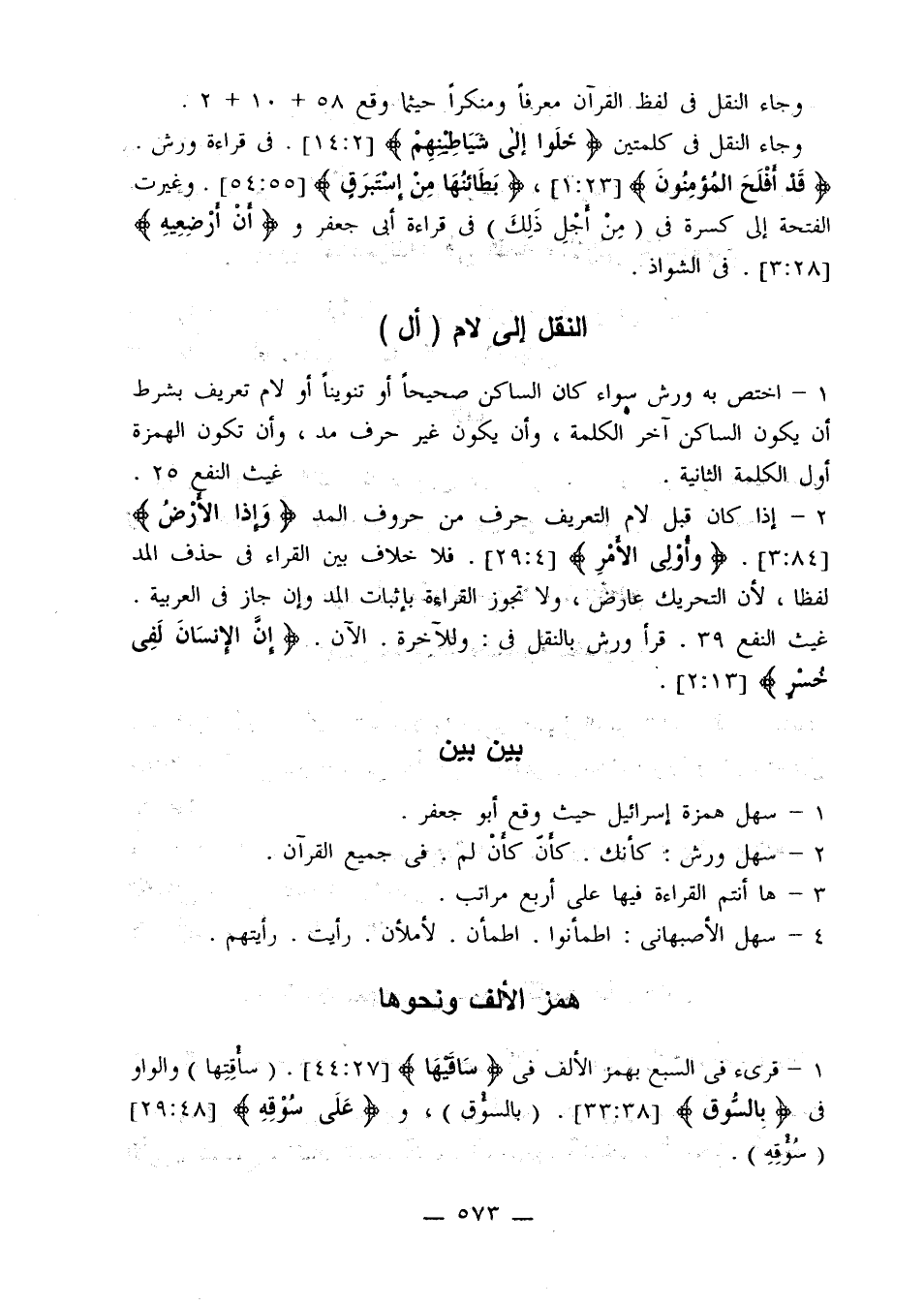 2 - إذا كان قبل لام التعريف حرف من حروف المد {وإذا الأرض} [84: 3]. {وأولي الأمر} [4: 29]. فلا خلاف بين القراء في حذف المد لفظًا، لأن التحريك عارض، ولا تجوز القراءة بإثبات المد وإن جاز في العربية. غيث النفع 39. قرأ ورش بالنقل في: وللآخرة. الآن. {إن الإنسان لفي خسر} [13: 2].