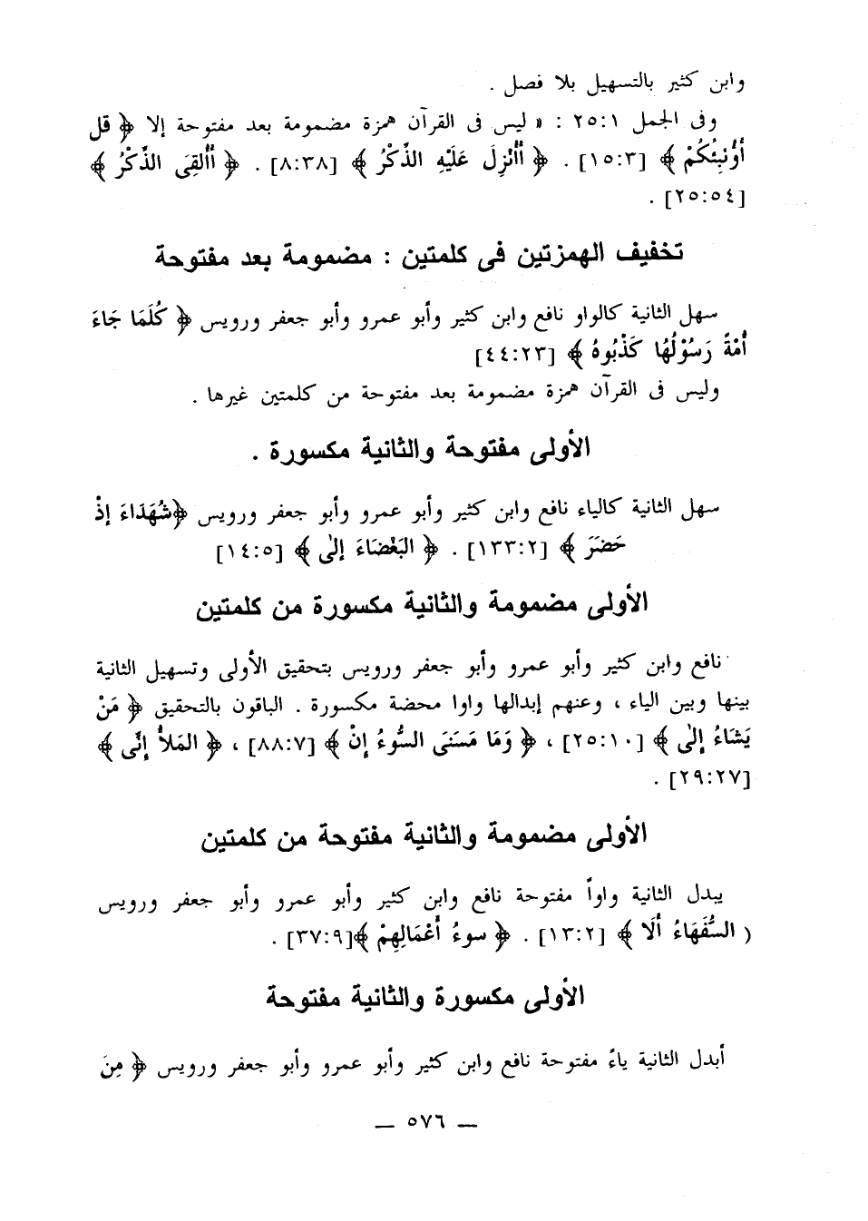 وفي الجمل 1: 25: «ليس في القرآن همزة مضمومة بعد مفتوحة إلا {قل أؤنبئكم} [3: 15]. {أأنزل عليه الذكر} [38: 8]. {أألقى الذكر} [54: 25]».