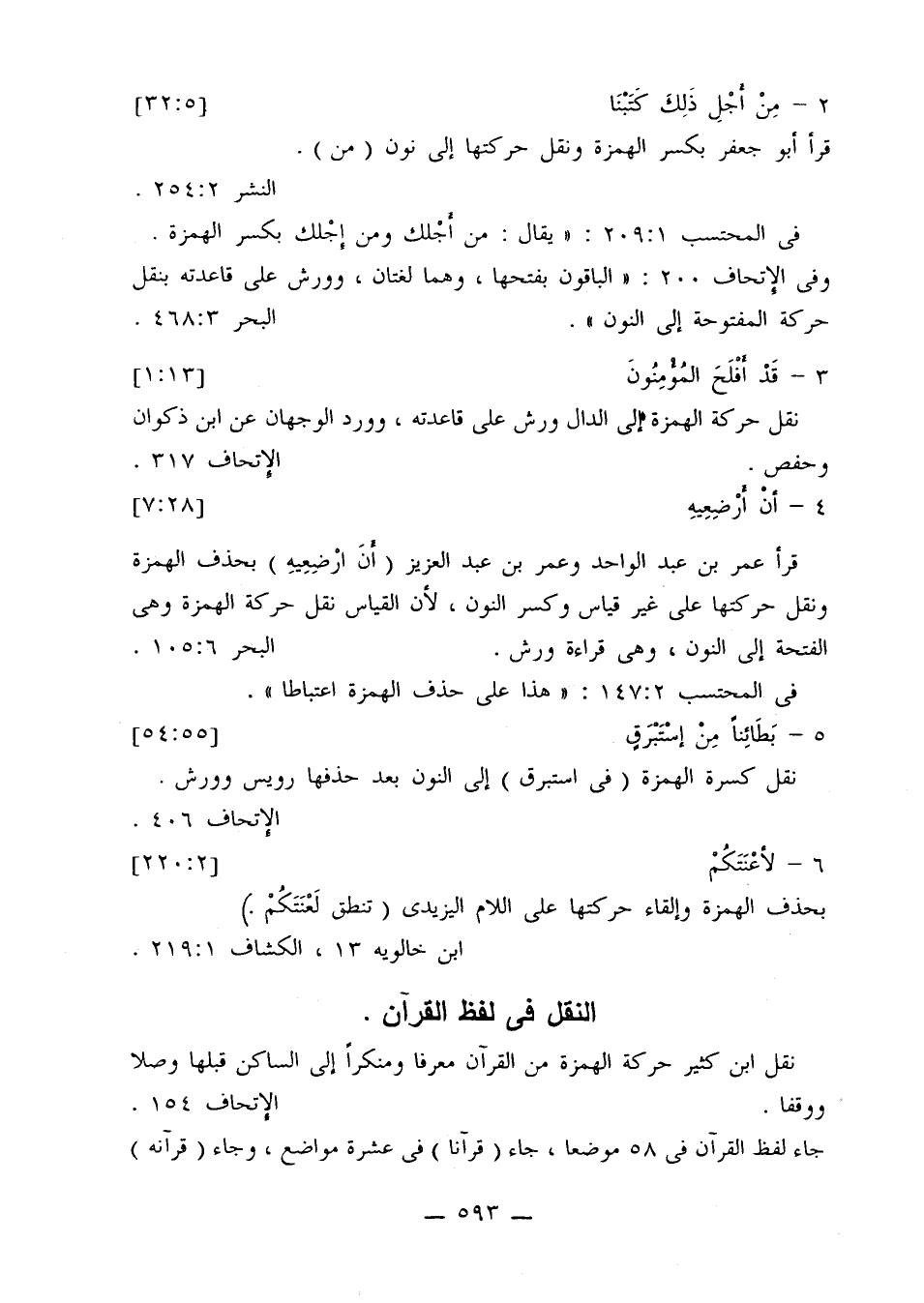 نقل ابن كثير حركة الهمزة من القرآن معرفًا ومنكرًا إلى السكن قبلها وصلا ووقفا. الإتحاف 154.