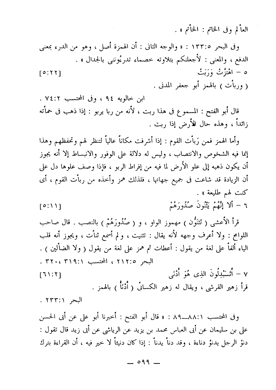 وفي المحتسب 1: 88 - 89: «قال أبو الفتح: أخبرنا أبو علي عن أبي الحسن علي بن سليمان عن أبي العباس محمد بن يزيد عن الرياشي عن أبي زيد قال تقول: دنؤ الرجل يدنؤ دناءة، وقد دنأ يدنأ: إذا كان دنيئًا لا خير فيه، أن القراءة بترك