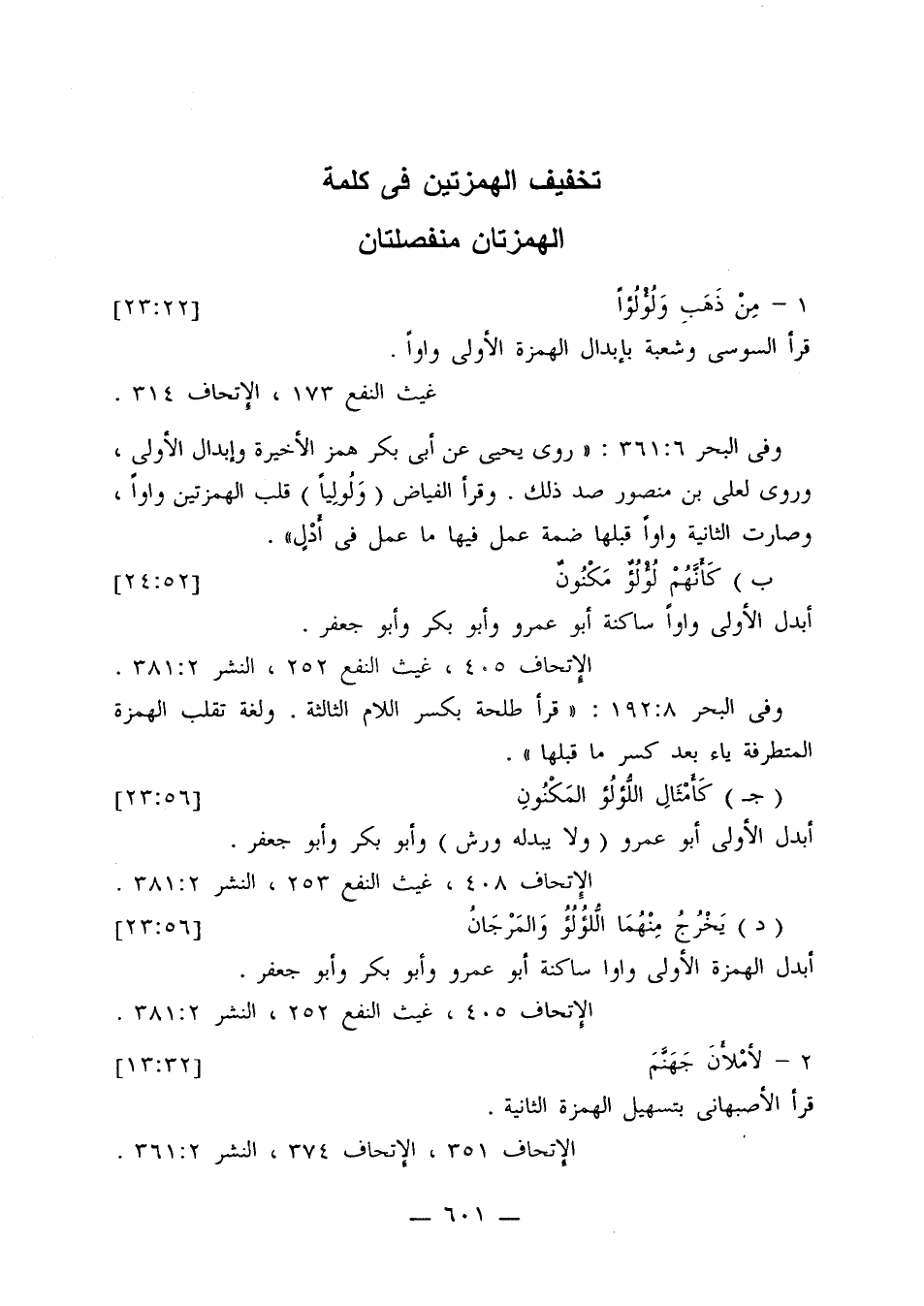 وفي البحر 6: 361: «روى يحيى عن أبي بكر همز الأخيرة وإبدال الأولى، وروى لعلي بن منصور صد ذلك. وقرأ الفياض (ولوليًا) قلب الهمزتين واوًا، وصارت الثانية واوًا قبلها ضمة عمل فيها ما عمل في أدل».