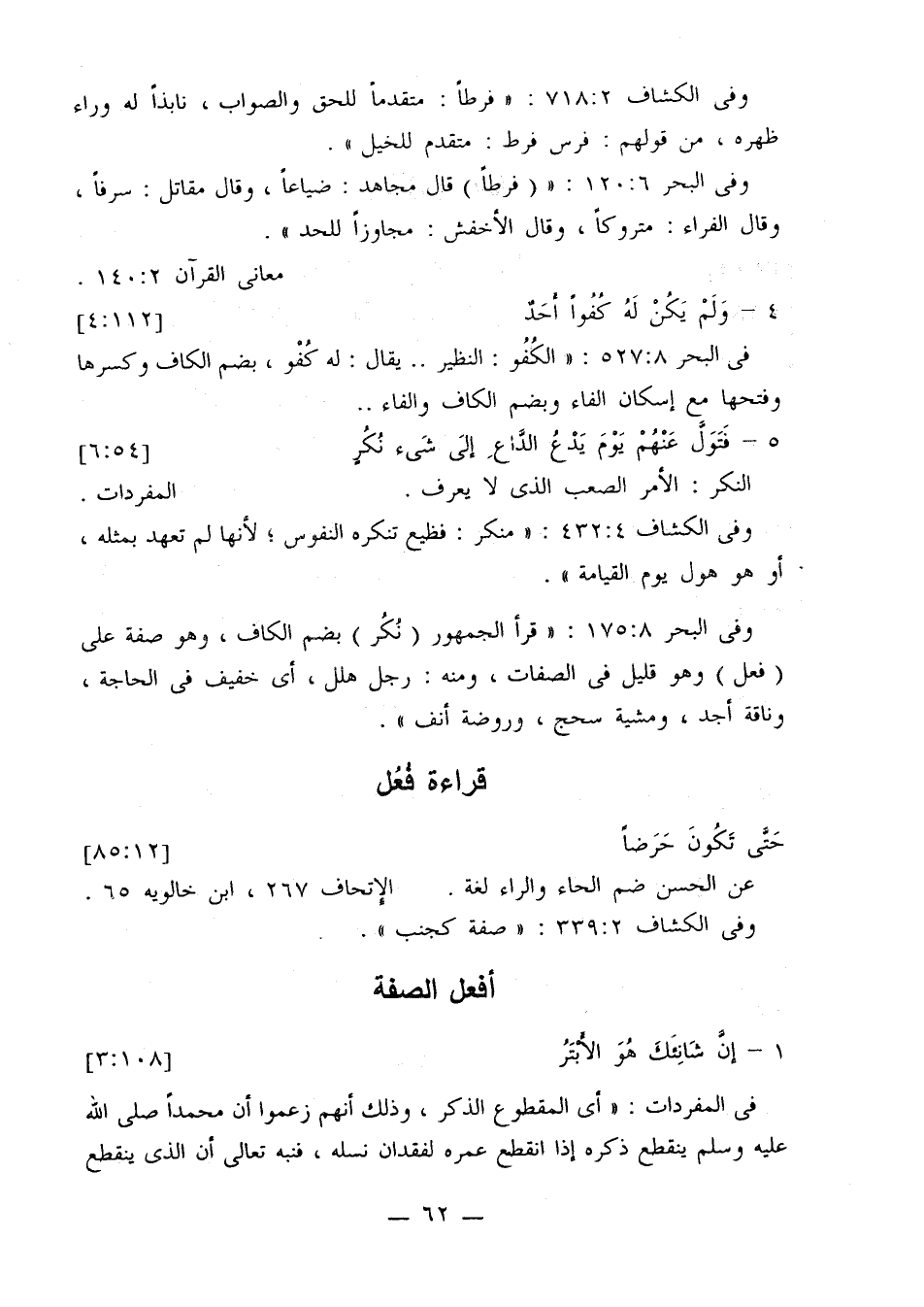 وفي البحر 175:8: «قرأ الجمهور (نكر) بضم الكاف، وهو صفة على (فعل) وهو قليل في الصفات، ومنه: رجل هلل، أي خفيف في الحاجة، وناقة أجد، ومشية سحج، وروضة أنف».