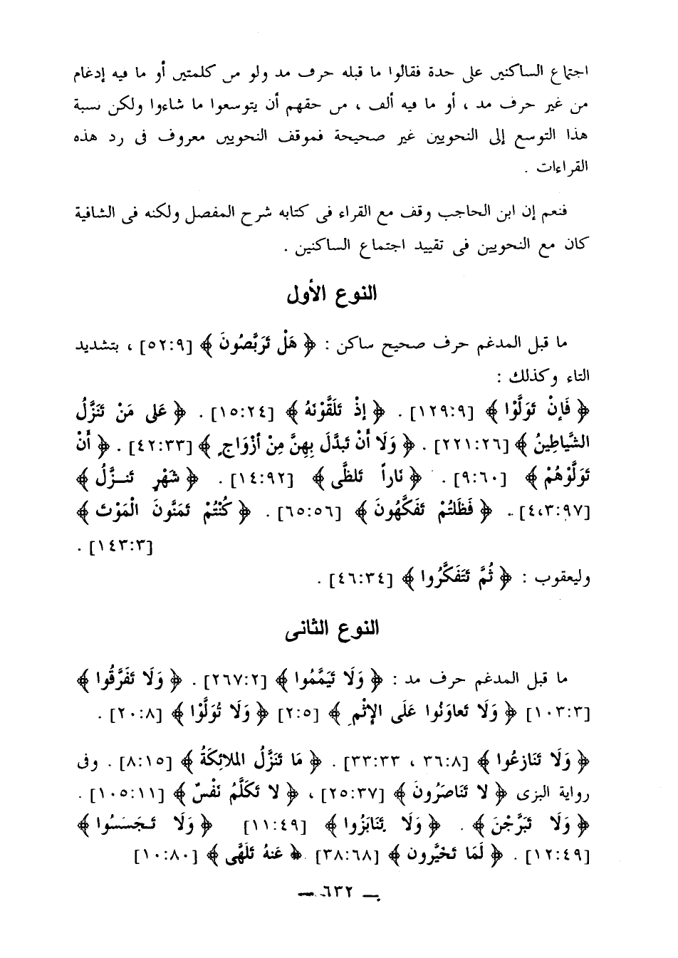 اجتماع الساكنين على حدة فقالوا ما قبله حرف مد ولو من كلمتين أو ما فيه إدغام من غير حرف مد، أو ما فيه ألف، من حقهم أن يتوسعوا ما شاءوا ولكن نسبة هذا التوسع إلى النحويين غير صحيحة فموقف النحويين معروف في رد هذه القراءات.