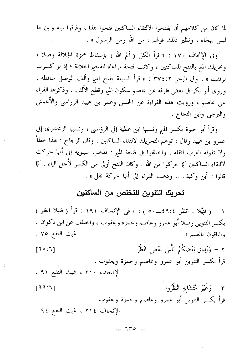 1 - (فتيلا. انظر 4: 49 - 50): «في الإتحاف 191: قرأ (فتيلا انظر) بكسر التنوين وصلا أبو عمرو وعاصم وحمزة ويعقوب، واختلف عن ابن ذكوان. والباقون بالضم».