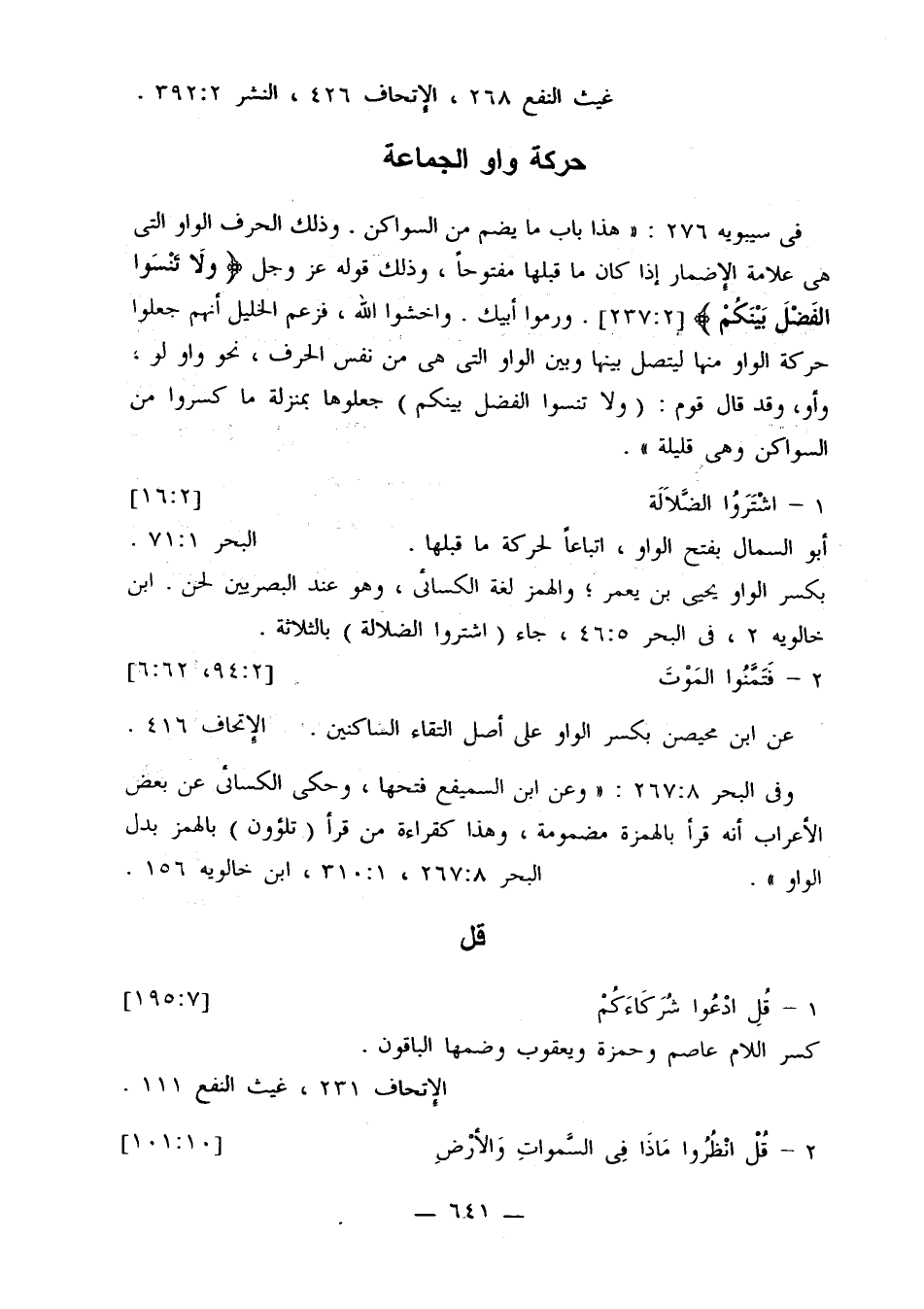 في سيبويه 276: «هذا باب ما يضم من السواكن. وذلك الحرف الواو التي هي علامة الإضمار إذا كان ما قبلها مفتوحًا، وذلك قوله عز وجل {ولا تنسوا الفضل بينكم} [2: 237]. ورموا أبيك. واخشوا الله، فزعم الخليل أنهم جعلوا حركة الواو منها ليتصل بينها وبين الواو التي هي من نفس الحرف، نحو واو لو، وأو، وقد قال قوم: (ولا تنسوا الفضل بينكم) جعلوها بمنزلة ما كسروا من السواكن وهي قليلة».