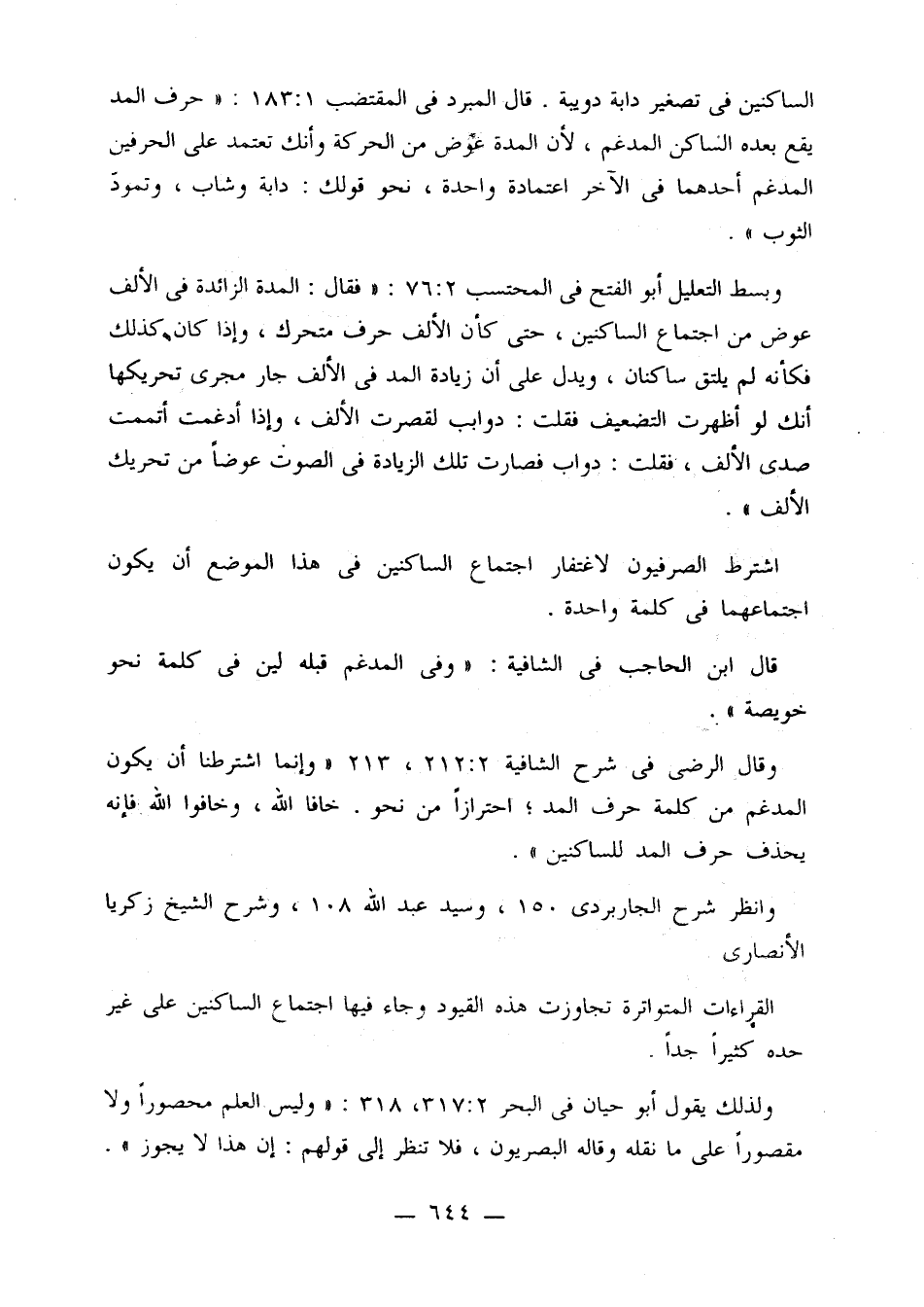 وبسط التعليل أبو الفتح في المحتسب 2: 76: «فقال: المدة الزائدة في الألف عوض من اجتماع الساكنين، حتى كأن الألف حرف متحرك، وإذا كان كذلك فكأنه لم يلتق ساكنان، ويدل على أن زيادة المد في الألف جار مجرى تحريكها أنك لو أظهرت التضعيف فقلت: دوابب لقصرت الألف، وإذا أدغمت أتممت صدى الألف، فقلت: دواب فصارت تلك الزيادة في الصوت عوضًا من تحريك الألف».