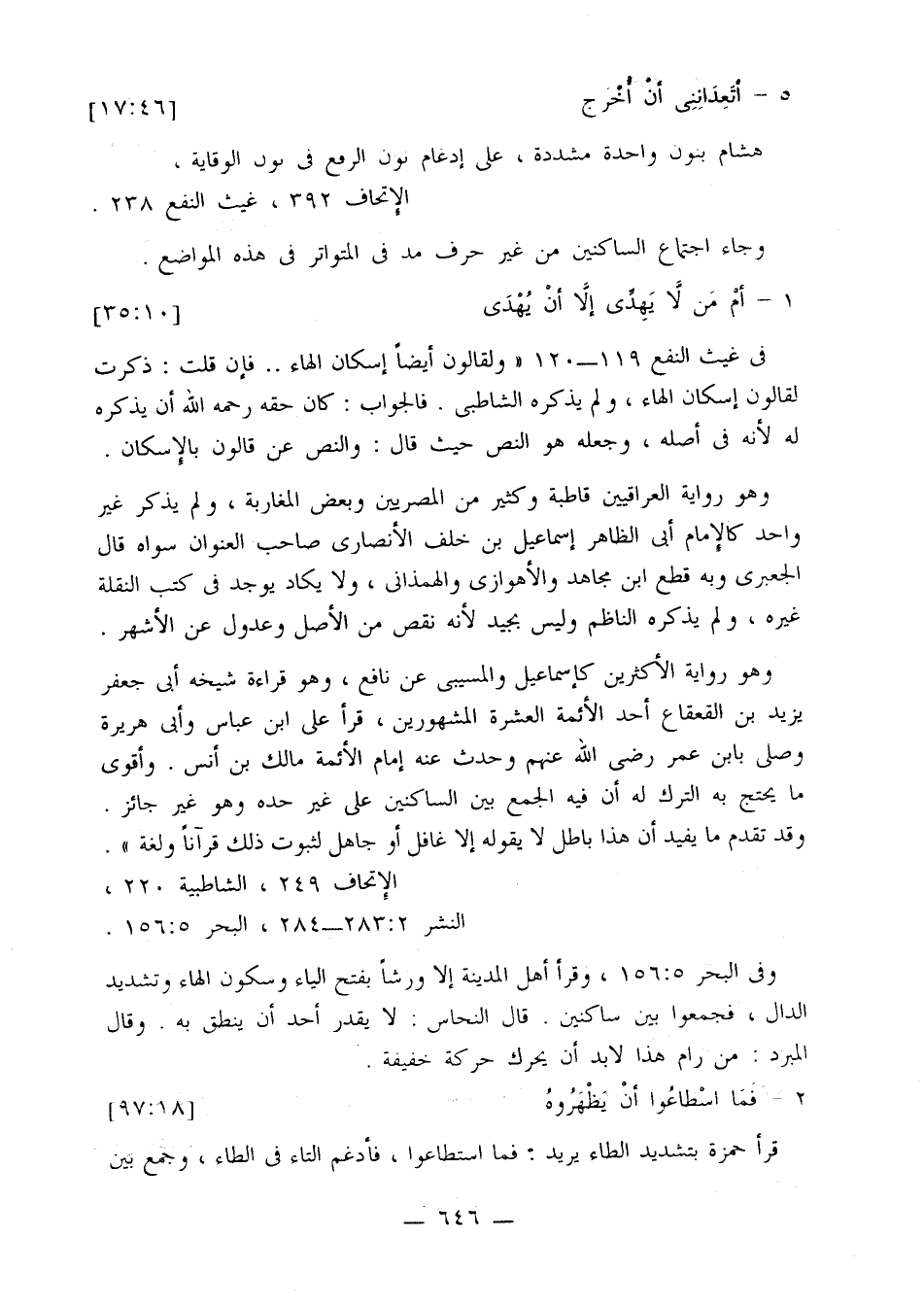 في غيث النفع 119 - 120: «ولقالون أيضًا إسكان الهاء ... فإن قلت: ذكرت لقالون إسكان الهاء، ولم يذكره الشاطبي. فالجواب: كان حقه رحمه الله أن يذكره له لأنه في أصله، وجعله هو النص حيث قال: والنص عن قالون بالإسكان.