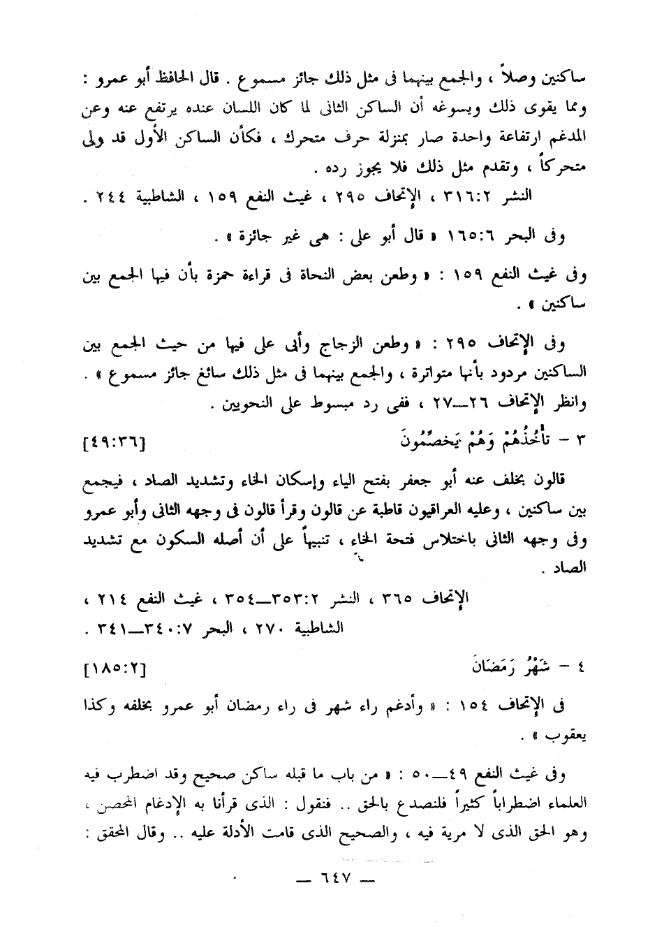 وفي غيث النفع 49 - 50: «من باب ما قبله ساكن صحيح وقد اضطرب فيه العلماء اضطرابًا كثيرًا فلنصدع بالحق ... فنقول: الذي قرأنا به الإدغام المحصن، وهو الحق الذي لا مرية فيه، والصحيح الذي قامت الأدلة عليه ... وقال المحقق