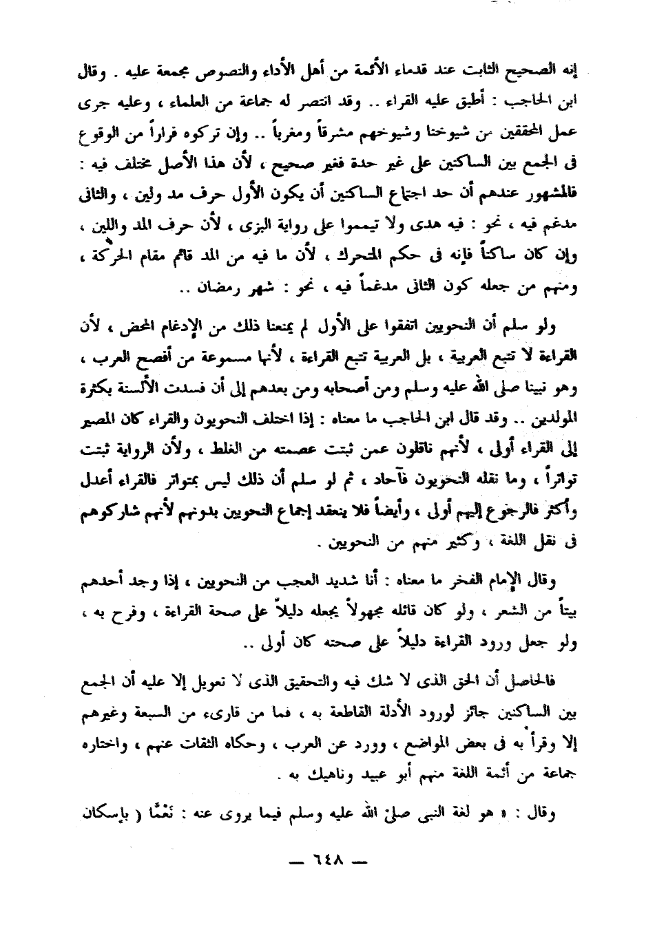 فالحاصل أن الحق الذي لا شك فيه والتحقق الذي لا تعويل إلا عليه أن الجمع بين الساكنين جائز لورود الأدلة القاطعة به، فما من قارئ من السبعة وغيرهم إلا وقرأ به في بعض المواضع، وورد عن العرب، وحكاه الثقات عنهم، واختاره جماعة من أئمة اللغة منهم أبو عبيد وناهيك به».