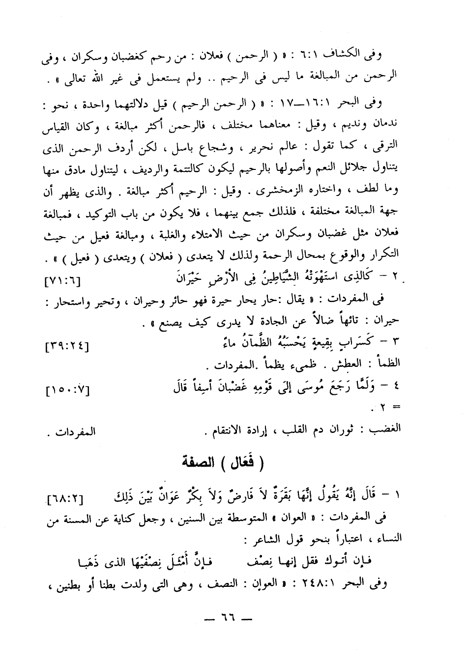 وفي البحر 16:1 - 17: «(الرحمن الرحيم) قيل دلالتهما واحدة، نحو: ندمان ونديم، وقيل: معناهما مختلف، فالرحمن أكثر مبالغة، وكان القياس الترقي، كما تقول: عالم نحرير، وشجاع باسل، لكن أردف الرحمن الذي يتناول جلائل النعم وأولها بالرحيم ليكون كالتتمة والرديف، ليتناول ما دق منها وما لطف، واختاره الزمخشري. وقيل: الرحيم أكثر مبالغة. والذي يظهر أن جهة المبالغة مختلفة، فلذلك جمع بينهما، فلا يكون من باب التوكيد، فمبالغة فعلان مثل غضبان وسكران من حيث الامتلاء والغلبة، ومبالغة فعيل من حيث التكرار والوقوع بمحال الرحمة ولذلك لا يتعدى (فعلان) ويتعدى (فعيل)».