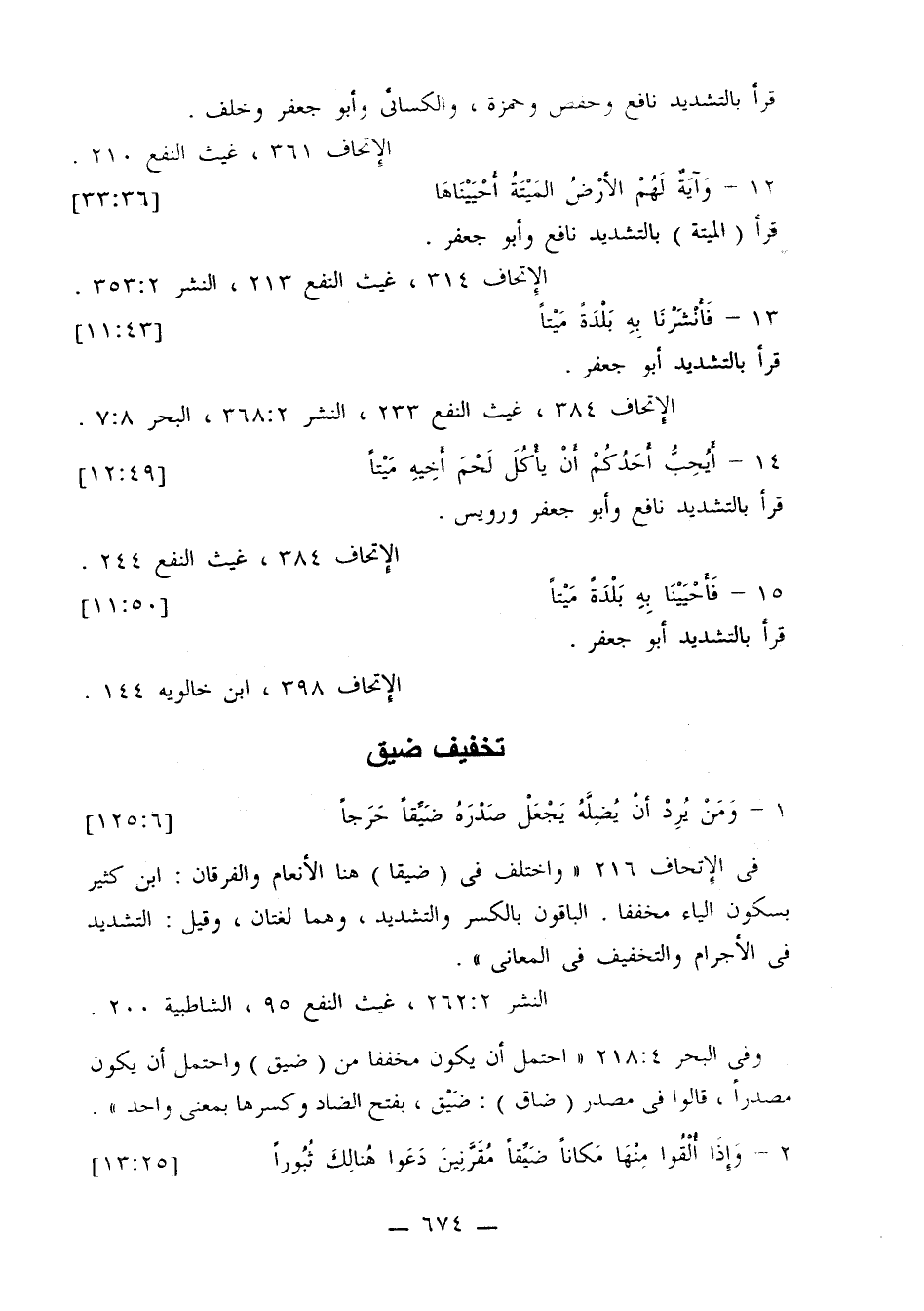 في الإتحاف 216: «واختلف في (ضيقا) هنا الأنعام والفرقان: ابن كثير بسكون الياء مخففًا. الباقون بالكسر والتشديد، وهما لغتان، وقيل: التشديد في الأجرام والتخفيف في المعاني».