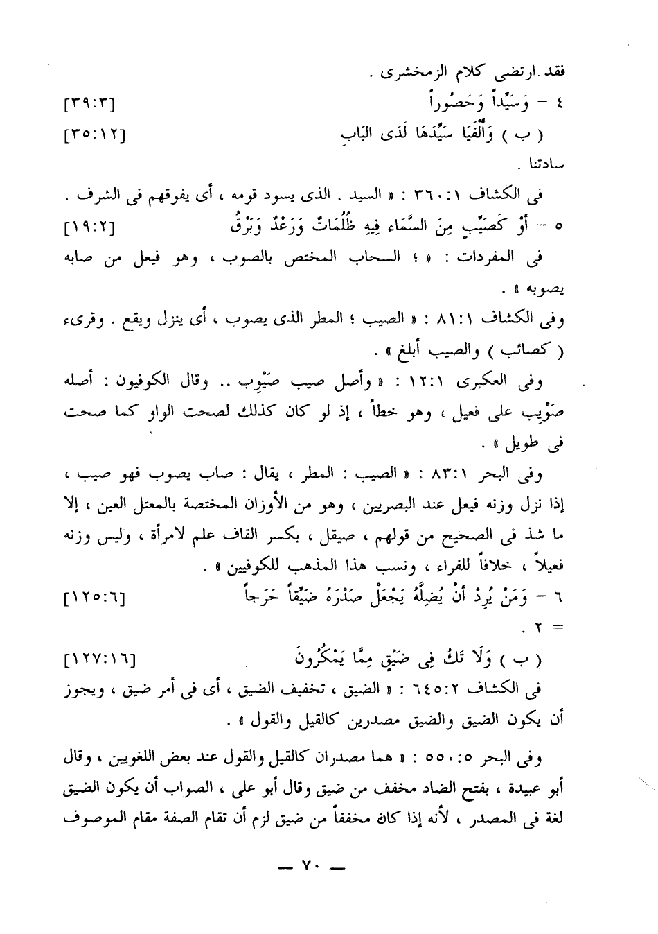 وفي البحر 81:1: «الصيب: المطر، يقال: صاب يصوب فهو صيب، إذا نزل وزنه فيعل عند البصريين، وهو من الأوزان المختصة بالمعتل العين، إلا ما شذ في الصحيح من قولهم، صيقل، بكسر القاف علم لامرأة، وليس وزنه فعيلاً، خلافًا للفراء، ونسب هذا المذهب للكوفيين».