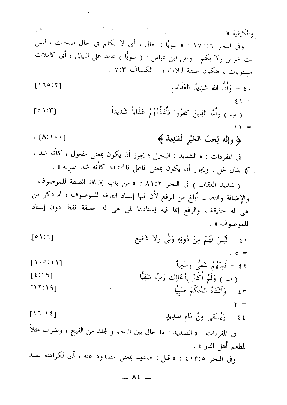 (شديد العقاب) في البحر 81:2: «من باب إضافة الصفة للموصوف. والإضافة والنصب أبلغ من الرفع لأن فيها إسناد الصفة للموصوف، ثم ذكر من هي له حقيقة، والرفع إنما فيه إسنادها لمن هي له حقيقة فقط دون إسناد للموصوف».
