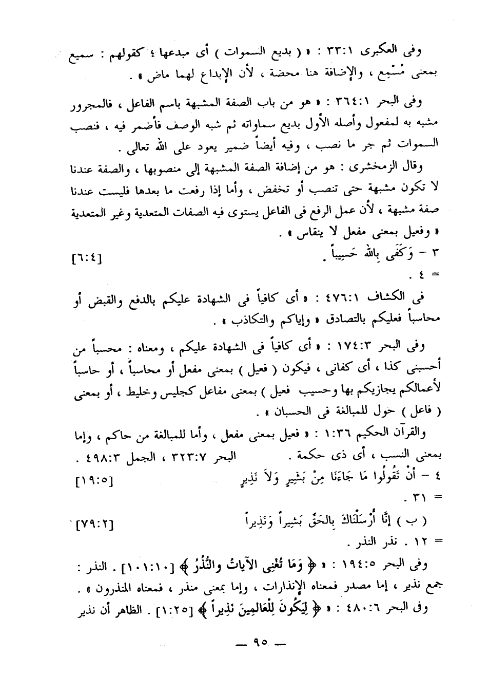 والقرآن الحكيم 1:36: «فعيل بمعنى مفعل، وأما للمبالغة من حاكم، وإما بمعنى النسب، أي ذي حكمة. البحر 323:7، الجمل 498:3.