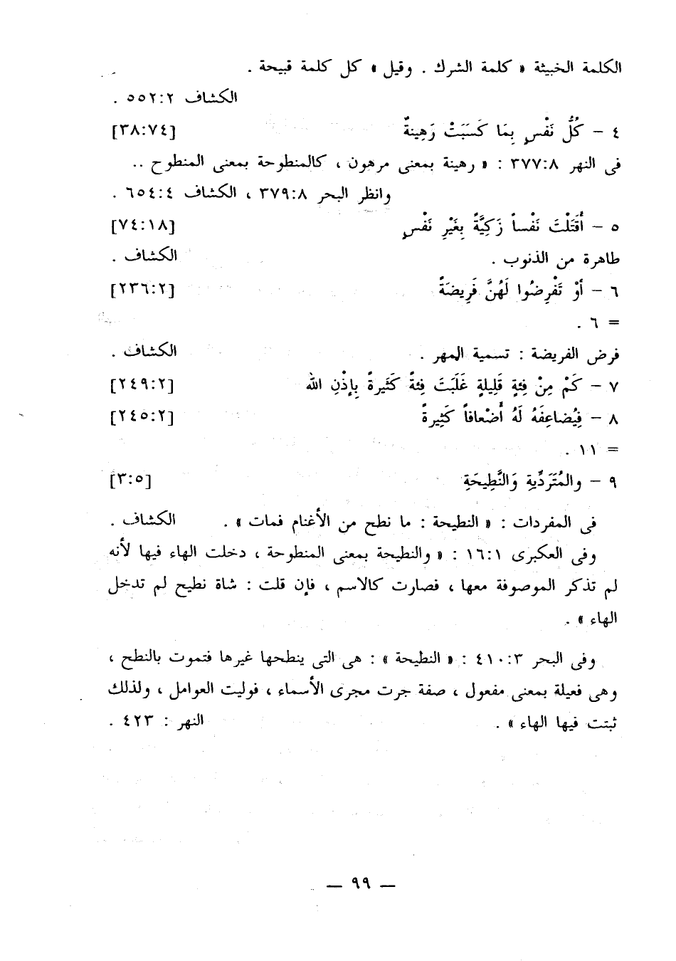 وفي البحر 410:3: «النطيحة»: هي التي ينطحها غير فتموت بالنطح، وهي فعيلة بمعنى مفعول، صفة جرت مجرى الأسماء، فوليت العوالم، وذلك ثبتت فيها الهاء». النهر: 423.