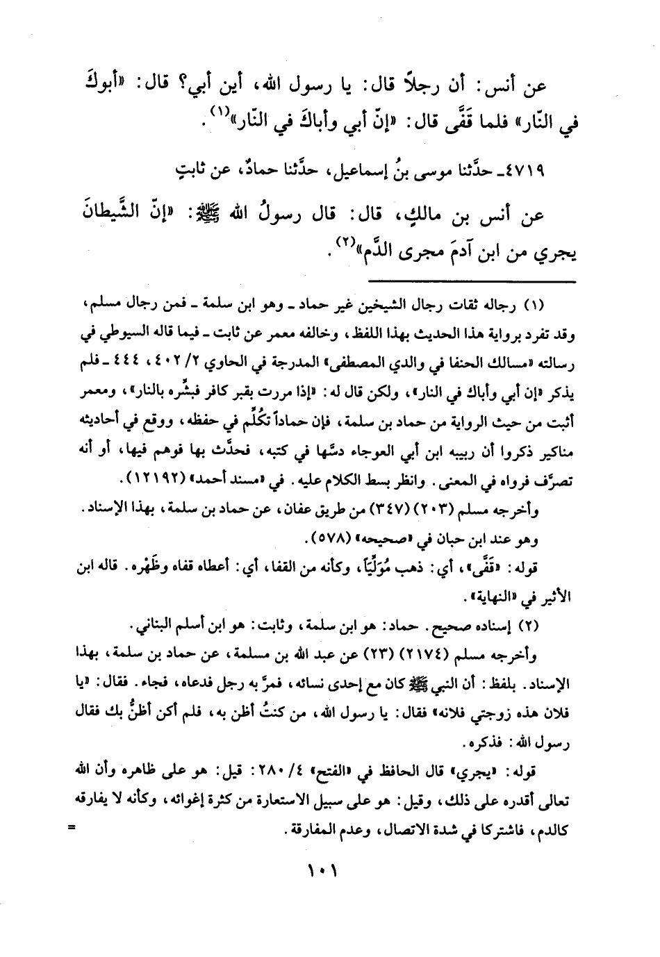 عن أنس بن مالكٍ، قال:"إنّ الشَّيطانَ يجري من ابن آدمَ مجرى الدَّم" (¬٢).