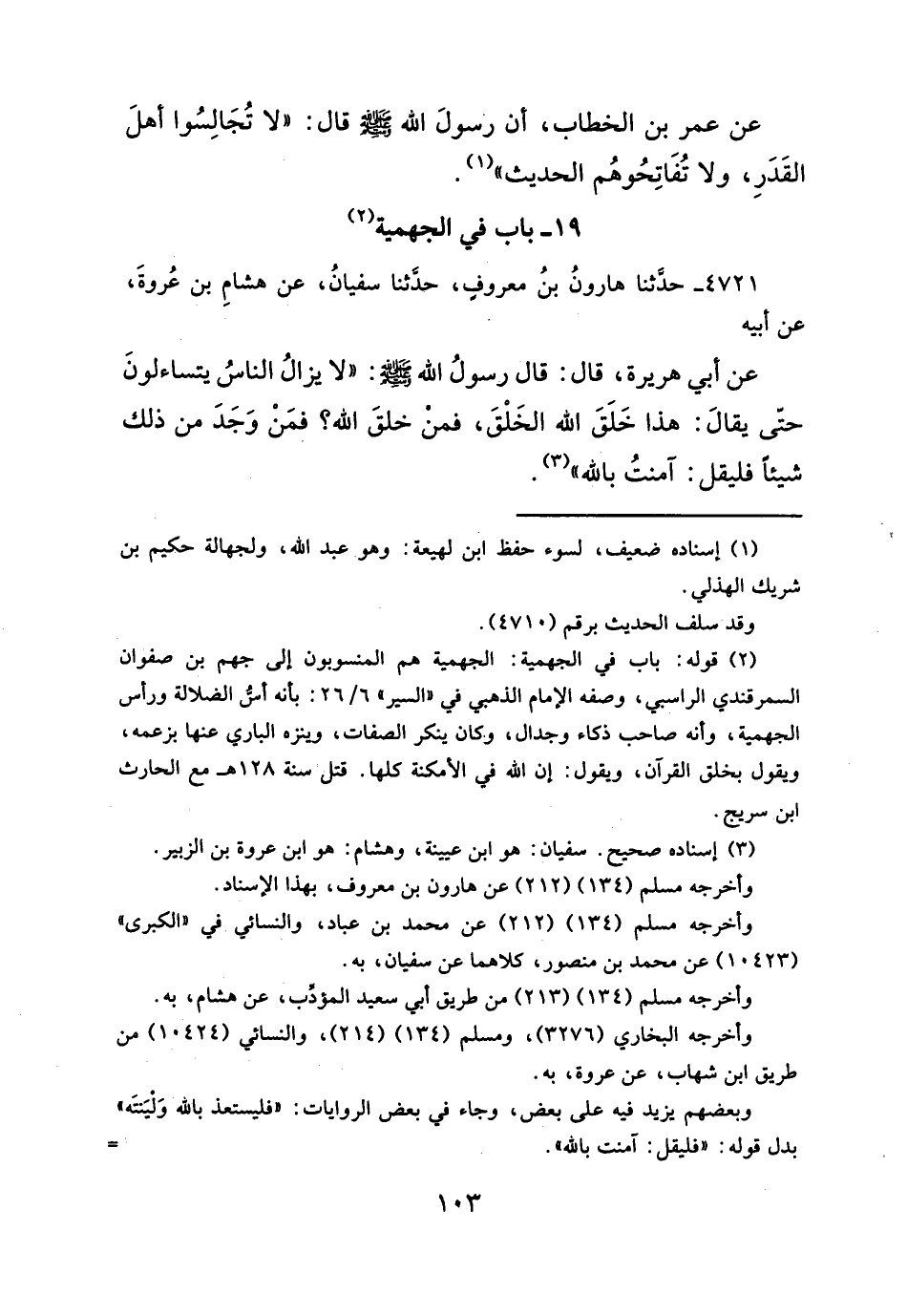 عن أبي هريرة، قال: قال رسولُ الله -صلى الله عليه وسلم--:" لا يزالُ الناسُ يتساءلونَ حتى يقالَ: هذا خَلَقَ الله الخَلْقَ، فمنْ خلقَ الله؟ فمَنْ وَجَدَ من ذلك شيئاً فليقل: آمنتُ بالله" (¬٣).