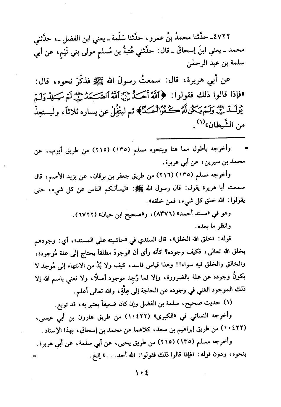 عن أبي هريرة، قال: سمعتُ رسولَ الله -صلى الله عليه وسلم -صلى الله عليه وسلم - فذكَرَ نحوه، قال: "فإذا قالوا ذلك فقولوا: {اللَّهُ الصَّمَدُ (٢) لَمْ يَلِدْ وَلَمْ يُولَدْ (٣) وَلَمْ يَكُنْ لَهُ كُفُوًا أَحَدٌ} ثم ليتْفُلْ عن يساره ثلاثاً، وليستعِذْ من الشَيطان" (¬١).