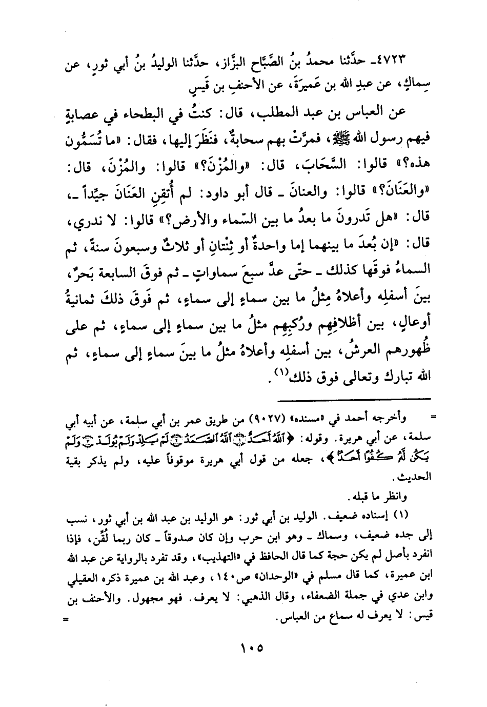 عن العباس بن عبد المطلب، قال: كنتُ في البطحاء في عصابةٍ فيهم رسول الله -صلى الله عليه وسلم-، فمرَّتْ بهم سحابةُ، فنَظَرَ إليها، فقال: "ما تُسَمُّون هذه؟ " قالوا: السَّحابَ، قال: "والمُزْنَ؟ " قالوا: والمُزْنَ، قال: "والعَنَانَ؟ " قالوا: والعنانَ -قال أبو داود: لم أُتقِنِ العَنَانَ جيِّداً-، قال: "هل تَدرونَ ما بعدُ ما بين السّماء والأرض؟ " قالوا: لا ندري، قال: "إن بُعدَ ما بينهما إما واحدٌ أو ثِنْتانِ أو ثلاثٌ وسبعونَ سنةً، ثم السماءُ فوقَها كذلك -حتّى عدَّ سبعَ سماواتٍ- ثم فوقَ السابعة بَحرٌ، بينَ أسفلِه وأعلاهُ مِثلُ ما بين سماءٍ إلى سماءٍ، ثم فَوقَ ذلكَ ثمانيةُ أوعالٍ، بين أظلافِهِم ورُكبِهِم مثلُ ما بين سماءٍ إلى سماءٍ، ثم على ظُهورهم العرشُ، بين أسفلِه وأعلاهُ مثلُ ما بينَ سماءٍ إلى سماءٍ، ثم الله تبارك وتعالى فوق ذلك (¬١).