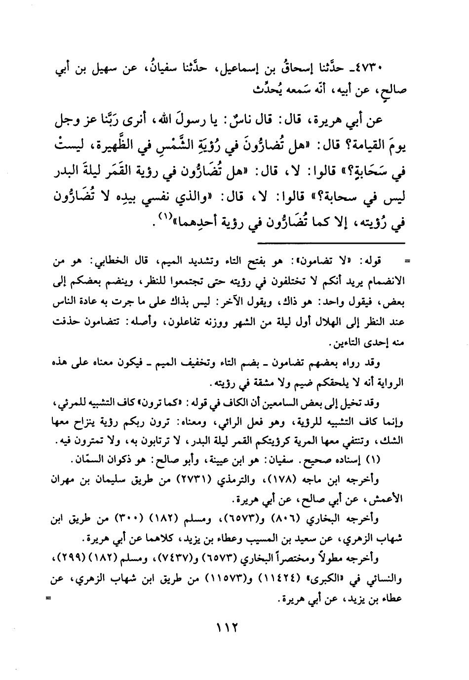 عن أبي هريرة، قال: قال ناس: يا رسولَ الله -صلى الله عليه وسلم -صلى الله عليه وسلم -، أنرى رَبَّنا عز وجل يومَ القيامة؟ قال: "هل تُضارُّونَ في رُؤيَةِ الشَمْسِ في الظَّهيرة، ليست في سَحَابةِ؟ " قالوا: لا، قال:"هل تُضَارُّون في رؤية القَمَر ليلةَ البدر ليس في سحابة؟ " قالوا: لا، قال: "والذي نفسي بيدِه لا تُضَارُّون في رُؤيته، إلا كما تُضَارُّون في رؤية أحدِهما" (¬١).