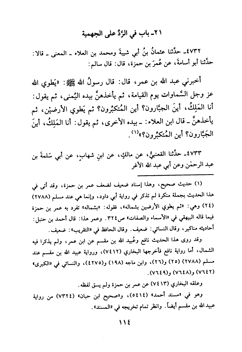 أخبرني عبد الله بن عمر، قال: قال رسولُ الله -صلى الله عليه وسلم -: "يَطوي الله عَزَّ وَجَلَّ السماوات يوم القيامة، ثم يأخذهنَّ بيده اليُمنى، ثم يقول: أنا المَلِكُ، أينَ الجبَّارون؛ أين المُتكبِّرون؛ ثم يَطوي الأرضيْن، ثم يأخذهنَّ -قال ابن العلاء:- بيده الأخرى، ثم يقول: أنا المَلِكُ، أينَ الجَبَّارون؟ أين المُتكبِّرون؟ " (¬١).