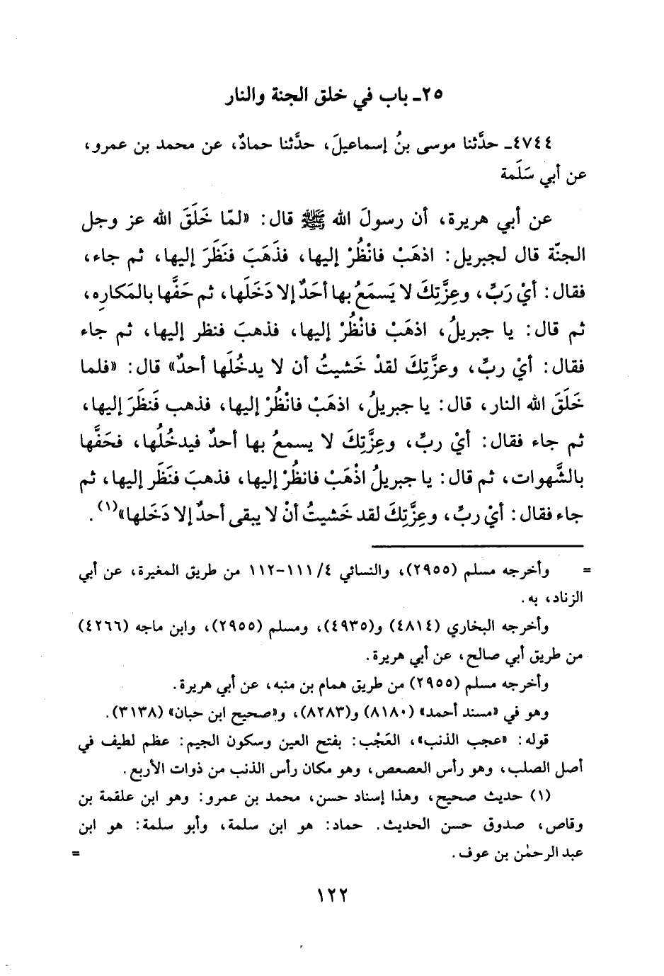 عن أبي هريرة، أن رسولَ الله -صلى الله عليه وسلم --صلى الله عليه وسلم -قال: "لمّا خَلَقَ الله عز وجل الجنّة قال لجبريل: اذهَبْ فانْظُرْ إليها، فذَهَبَ فنَظَرَ إليها، ثم جاء، فقال: أيْ رَبِّ، وعِزَّتكَ لا يَسمَع بها أحَدٌ إلا دَخَلَها، ثم حَفَّها بالمَكارِه، ثم قال: يا جبريلُ، اذهَبْ فانظُرْ إليها، فذهبَ فنظر إليها، ثم جاء فقال: أيْ ربِّ، وعزَتِكَ لقذ خَشيتُ أن لا يدخُلَها أحدٌ" قال: "فلما خَلَقَ الله النار، قال: يا جبريلُ، اذهَبْ فانْظُرْ إليها، فذهب فَنظَرَ إليها، ثم جاء فقال: أيْ ربَّ، وعِزَّتك لا يسمعُ بها أحد فيدخُلُها، فحَفَّها بالشَهوات، ثم قال: يا جبريلُ اذْهَبْ فانظُرْ إليها، فذهبَ فنَظَر إليها، ثم جاء فقال: أى ربَّ، وعِزَّتك لقد خَشيتُ أنْ لا يبقى أحدٌ إلا دَخَلها" (¬١).
