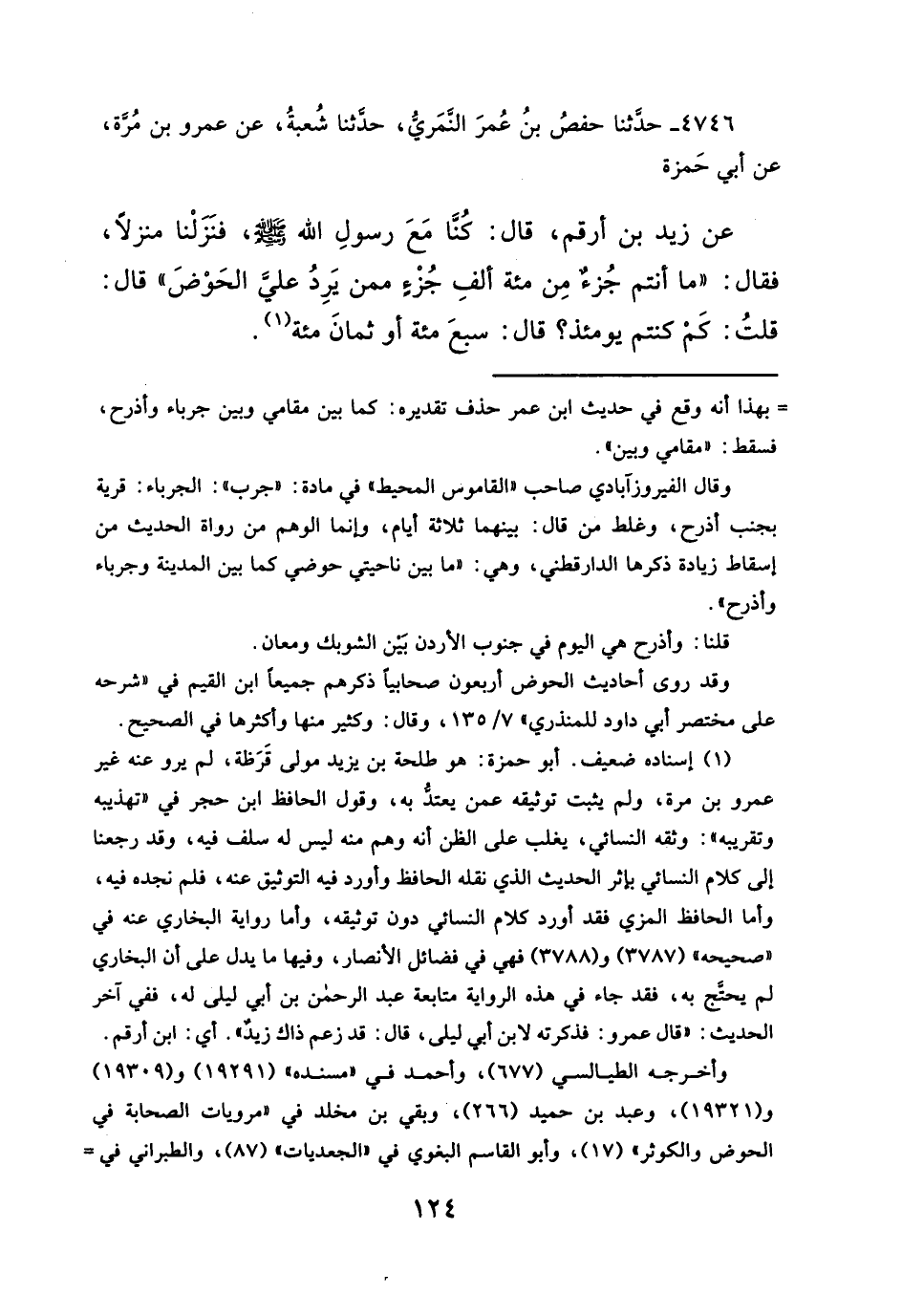 عن زيد بن أرقم، قال: كُنَّا مَعَ رسولِ الله -صلى الله عليه وسلم-، فنزَلْنا منزلاً، فقال: "ما أنتم جُزءٌ مِن مئة ألفِ جُزْءٍ ممن يَرِدُ عليَّ الحَوْضَ" قال: قلتُ: كَمْ كنتم يومئذ؟ قال: سبعَ مئة أو ثمانَ مئة (¬١).