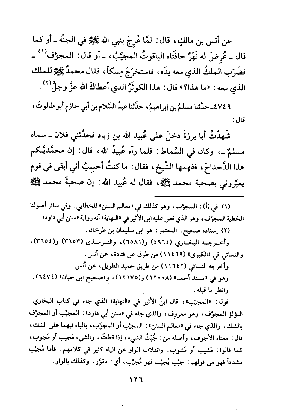 عن أنس بن مالكِ، قال: لمَّا عُرِجَ بنبي الله في الجنّة -أو كما قال- عُرِضَ له نَهَرٌ حافَتَاه الياقوتُ المجيَّبُ، -أو قال: المجوَّف (¬١) - فضَرَب الملكُ الذي معه يدَه، فاستخرَجَ مِسكاَ، فقال محمدٌ - صلى الله عليه وسلم - للملك الذي معه: "ما هذا؟ " قال: هذا الكوثَرُ الذي أعطاكَ الله عزَّ وجلَّ (¬٢).