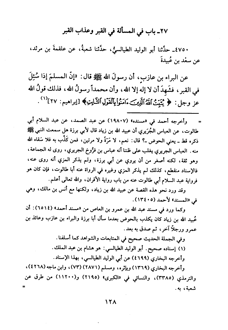 عن البراء بن عازبِ، أن رسولَ الله -صلى الله عليه وسلم - قال: "إنّ المسلمَ إذا سُئِلَ في القبر، فشَهِدَ أن لا إله إلا الله، وأن محمداً رسولُ الله -صلى الله عليه وسلم-، فذلك قولُ الله عز وجل: {يُثَبِّتُ اللَّهُ الَّذِينَ آمَنُوا بِالْقَوْلِ الثَّابِتِ} [إبراهيم: ٢٧] (¬١).