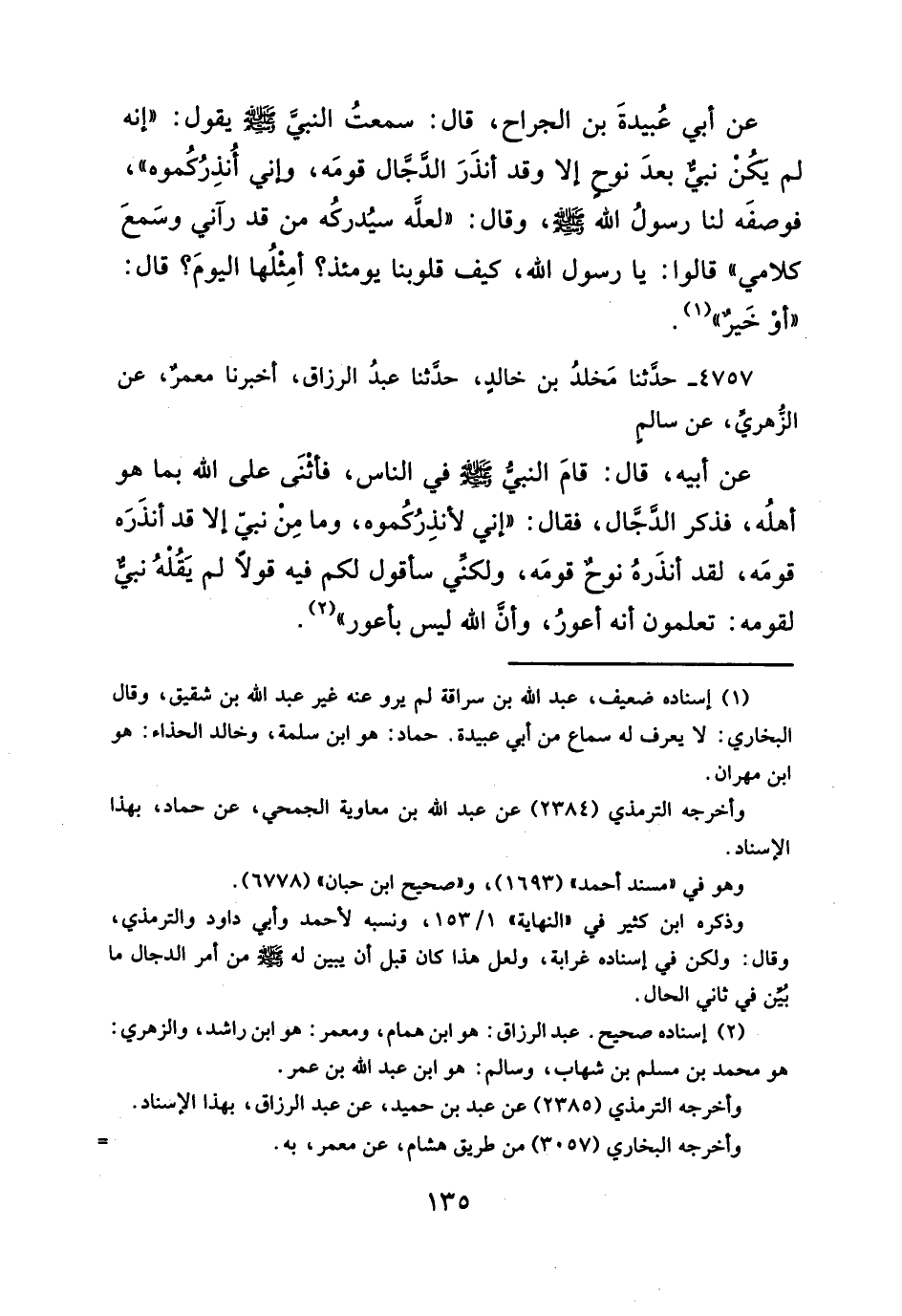 عن أبي عُبيدةَ بن الجراح، قال: سمعتُ النبيَّ - صلى الله عليه وسلم - يقول: "إنه لم يَكُنْ نبيٌّ بعدَ نوحٍ إلا وقد أنذَرَ الدَّجَّال قومَه، وإني أُنذِرُكُموه"، فوصفَه لنا رسولُ الله -صلى الله عليه وسلم-، وقال: "لعلَّه سيُدركُه من قد رآني وسَمعَ كلامي" قالوا: يا رسول الله -صلى الله عليه وسلم-، كيف قلوبنا يومئذ؟ أمِثْلُها اليومَ؟ قال: "أوْ خَيرٌ" (¬١).
