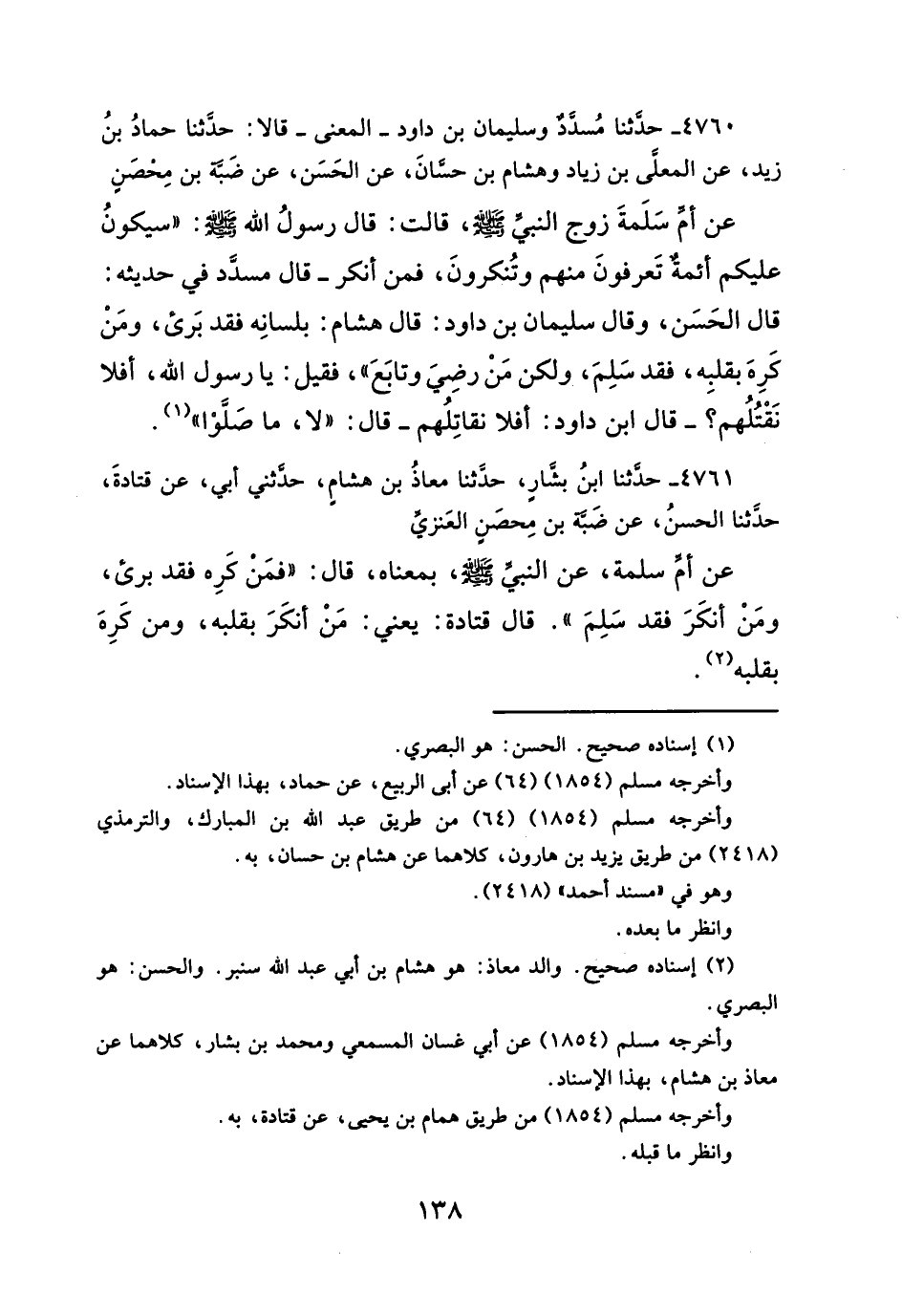 عن أمِّ سَلَمةَ زوج النبيَّ - صلى الله عليه وسلم، قالت: قال رسولُ الله -صلى الله عليه وسلم-: "سيكونُ عليكم أئمةٌ تَعرفونَ منهم وتُنكرونَ، فمن أنكر - قال مسدَّد في حديثه: قال الحَسَنُ، وقال سليمان بن داود: قال هشام: بلسانِه فقد بَرئ، ومَنْ كَرِهَ بقلبِه، فقد سَلِمَ، ولكن مَنْ رضِيَ وتابَعَ"، فقيل: يا رسول الله، أفلا نَقْتُلُهم؟ -قال ابن داود: أفلا نقاتِلُهم- قال:" لا، ما صَلَّوْ" (¬١).