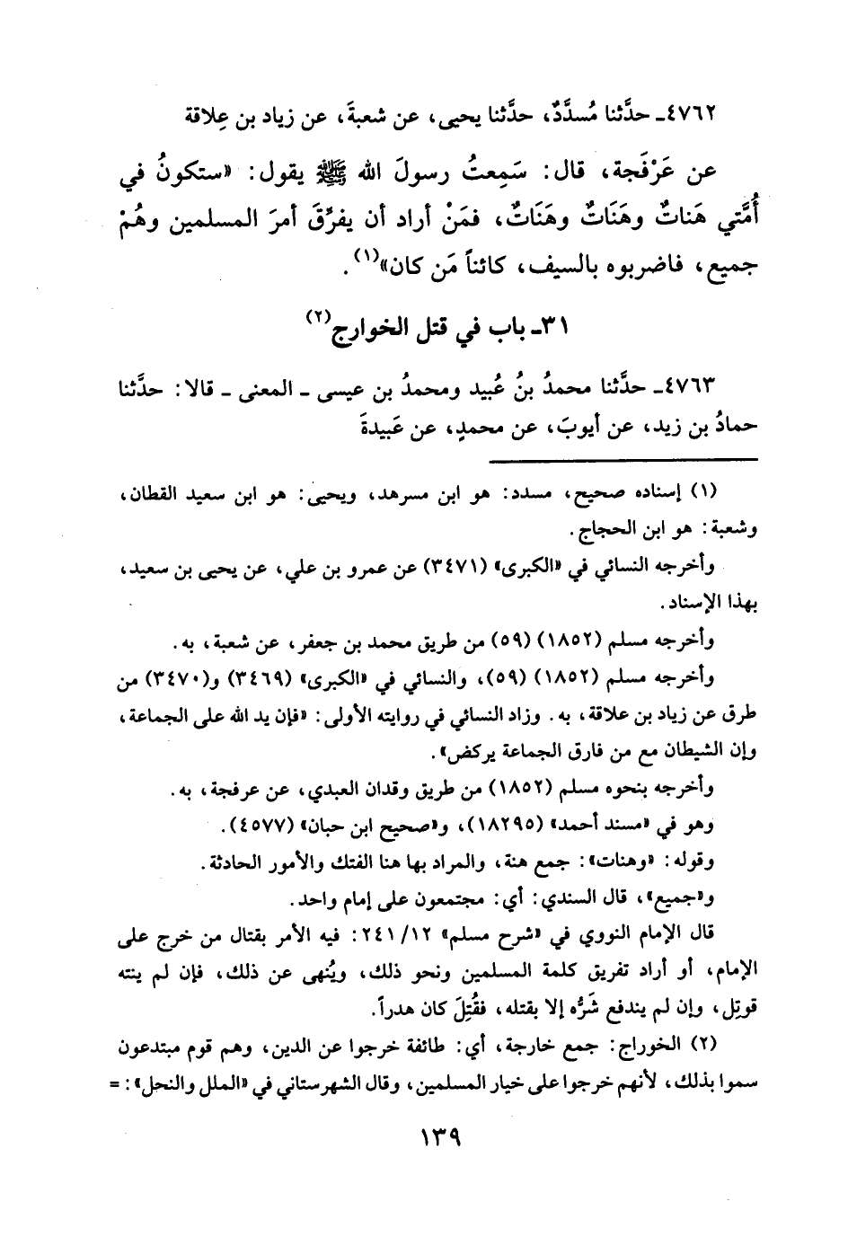 عن عَرْفَجة، قال: سَمِعتُ رسولَ الله -صلى الله عليه وسلم -يقول: "ستكونُ في أُمَّتي هَناتُ وهَنَاتٌ وهَنَاتٌ، فمَنْ أراد أن يفرّقَ أمرَ المسلمين وهُمْ جميع، فاضربوه بالسيف، كائناً مَن كان" (¬١).