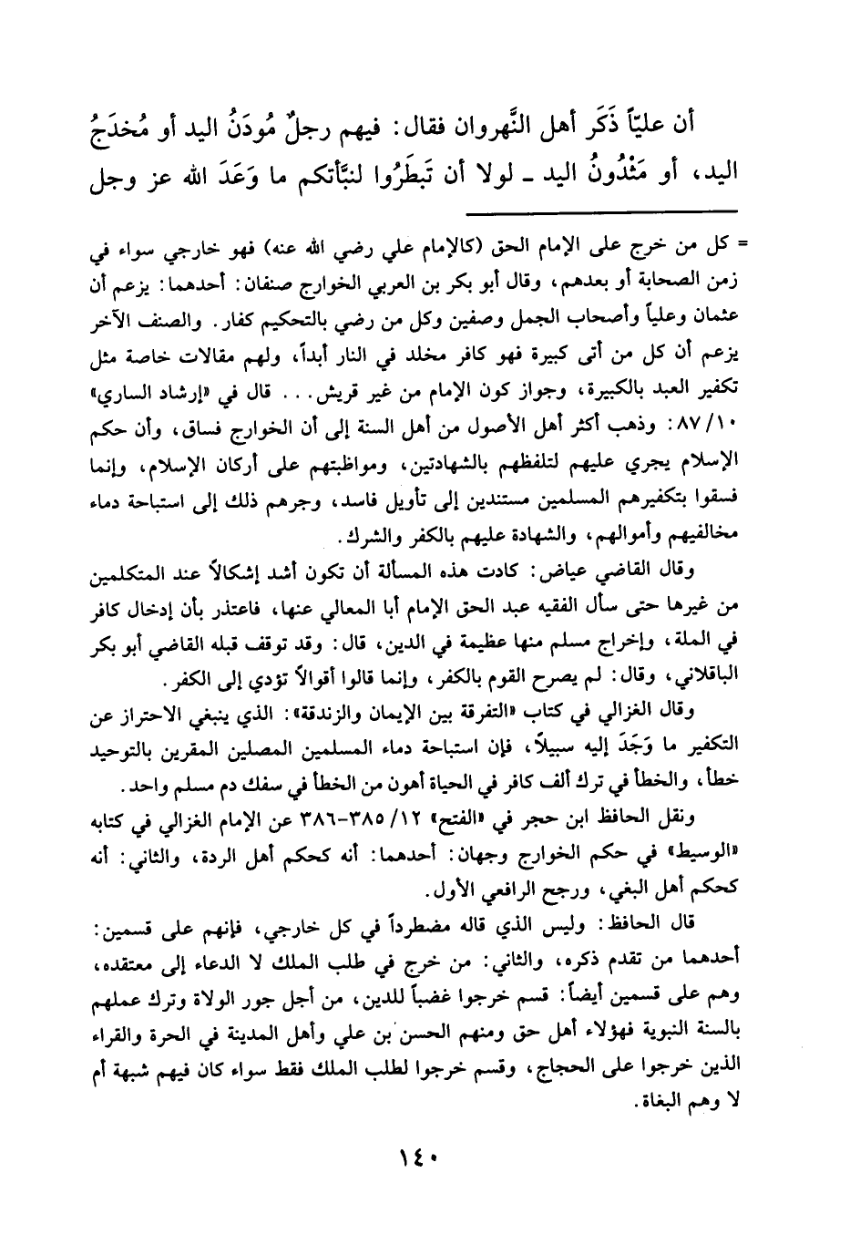 ونقل الحافظ ابن حجر في "الفتح" ١٢/ ٣٨٥ - ٣٨٦ عن الإِمام الغزالي في كتابه "الوسيط" في حكم الخوارج وجهان: أحدهما: أنه كحكم أهل الردة، والثاني: أنه حكم أهل البغي، ورجح الرافعي الأول.