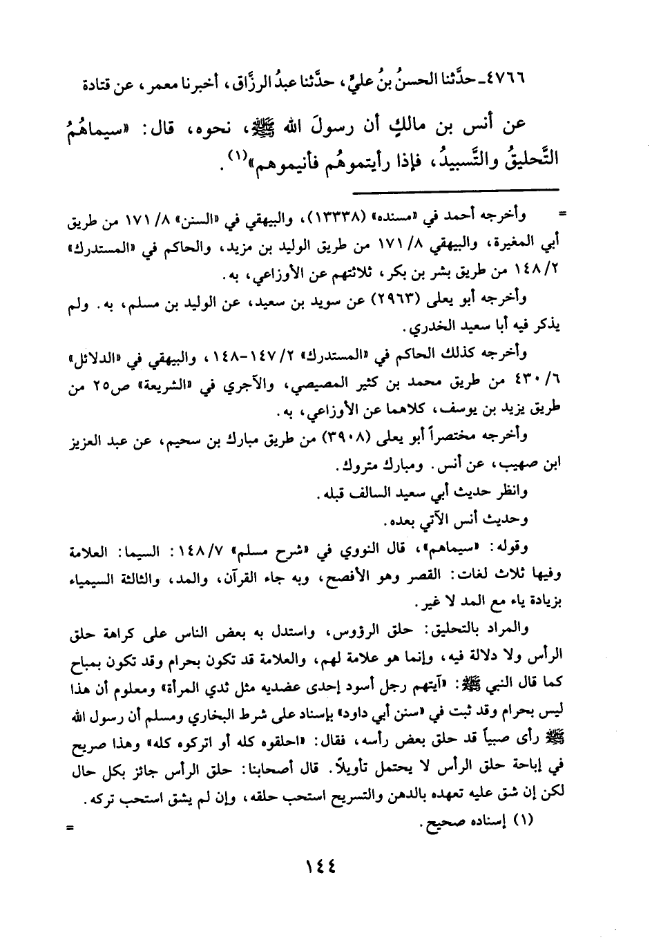 عن أنس بن مالكِ أن رسولَ الله -صلى الله عليه وسلم -، نحوه، قال: "سيماهُمُ التَّحليقُ والتَّسبيدُ، فإذا رأيتموهُم فأنيموهم" (¬١).