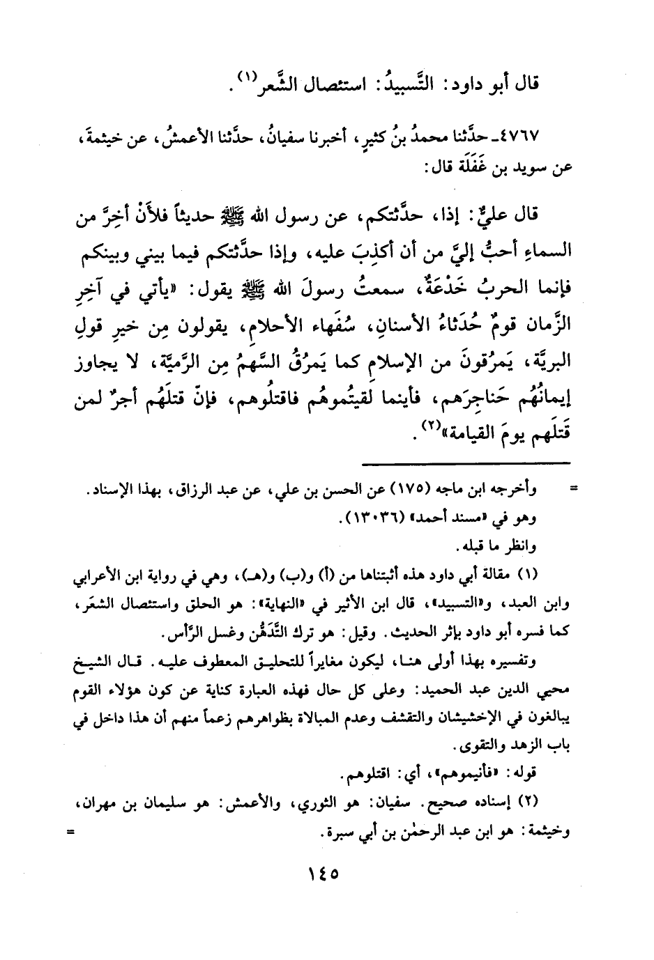 (¬١) مقالة أبي داود هذه أثبتناها من (١) و (ب) و (هـ)، وهي في رواية ابن الأعرابي وابن العبد، و"التسبيد"، قال ابن الأثير في "النهاية": هو الحلق واستئصال الشعَر، كما فسره أبو داود بإثر الحديث. وقيل: هو ترك التَّدَهن وغسل الرَّأس.