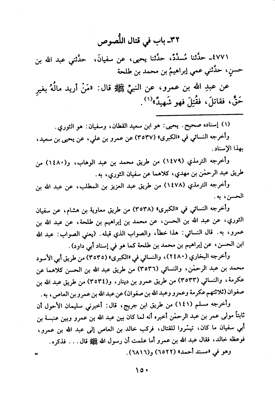 عن عبدِ الله بن عمرو، عن النبيِّ-صلى الله عليه وسلم- قال: "مَنْ أريد مالُهُ بغيرِ حَق، فقاتلَ، فقُتِلَ فهو شَهيدٌ" (¬١).