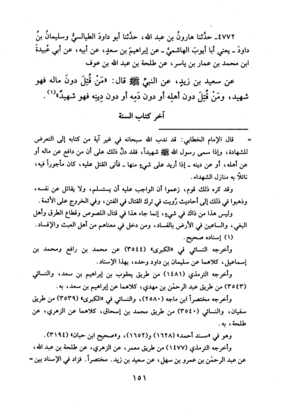 عن سعيد بن زيدٍ، عن النبي-صلى الله عليه وسلم- قال: "مَنْ. قُتِلَ دونَ ماله فهو شهيد، ومَنْ قُتِلَ دون أهلِه أو دون دَمِه أو دون دِينِه فهو شهيدٌ" (¬١).
