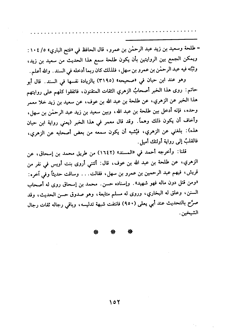 = طلحة وسعيد بن زيد عبد الرحمن بن عمرو، قال الحافظ في "فتح الباري " ٥/ ١٠٤: ويمكن الجمع بين الروايتين بأن يكون طلحة سمع هذا الحديث من سعيد بن زيد، وثبته فيه عبد الرحمن بن عمرو بن سهل، فلذلك كان ربما أدخله في السند. والله أعلم.