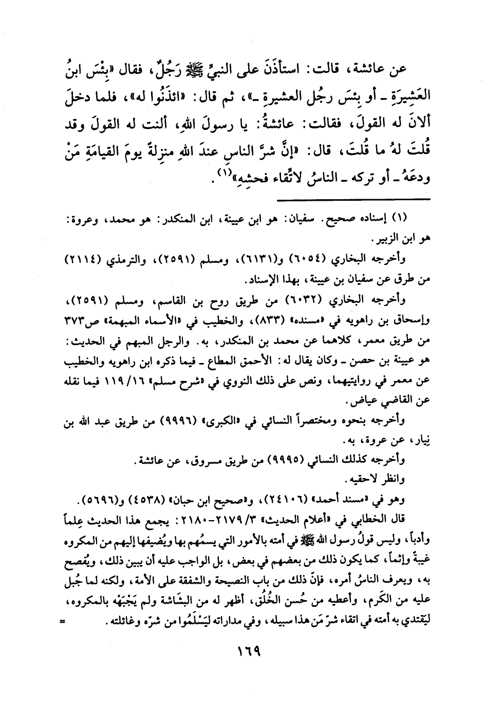 عن عائشة، قالت: استأذَنَ على النبيَّ- صلى الله عليه وسلم - رَجُل، فقال "بِئسَ ابنُ العَشِيرَةِ -أو بِئسَ رجُل العشيرةِ-"، ثم قال: "ائذَنُوا له"، فلما دخلَ ألانَ له القولَ، فقالت: عائشةُ: يا رسولَ الله -صلى الله عليه وسلم، ألنت له القولَ وقد قُلتَ لهُ ما قُلتَ، قال: "إنَّ شرَّ الناسِ عندَ اللهِ منزِلةً يومَ القيامَةِ مَن ودعَهُ -أو تركه- الناسُ لاتِّقاء فحشِهِ" (¬١).
