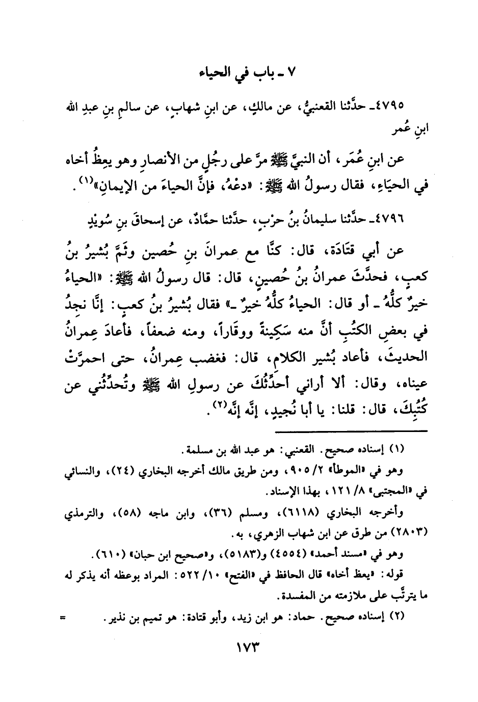 عن أبي قتَادَة، قال: كنا مع عمرانَ بنِ حُصين وثَمَّ بُشيرُ بنُ كعبٍ، فحدَّثَ عمرانُ بنُ حُصينٍ، قال: قال رسولُ الله -صلى الله عليه وسلم: "الحياءُ خيرُ كلُّهُ -أو قال: الحياءُ كلُّهُ خير-" فقال بُشيرُ بنُ كعب: إنَا نجِدُ في بعضِ الكتُبِ أنَّ منه سَكينةً ووقَاراً، ومنه ضعفاً، فأعادَ عِمرانُ الحديثَ، فأعاد بُشير الكلامِ، قال: فغضب عِمرانُ، حتى احمرَّتْ عيناه، وقال: ألا أراني أحدِّثُكَ عن رسولِ الله -صلى الله عليه وسلم- وتُحدِّثُني عن كُتُبِكَ، قال: قلنا: يا أبا نُجيدٍ، إنه إنَّه (¬٢).