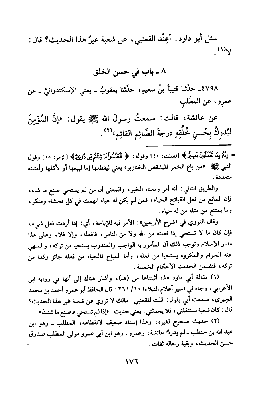 (¬١) مقالة أبي داود هذه أثبتناها من (هـ)، وأشار هناك إلى أنها في رواية ابن الأعرابي، وجاء في "سير أعلام النبلاء" ١٠/ ٢٦١: قال الحافظ أبو عمرو أحمد بن محمَّد الحِيري، سمعت أبي يقول: قلت للقعنبي: مالك لا تروى عن شعبة غير هذا الحديث؟ قال: كان شعبة يستثقلني، فلا يحدثني. يعني حديث: "إذا لم تستحي فاصنع ما شئتَ".