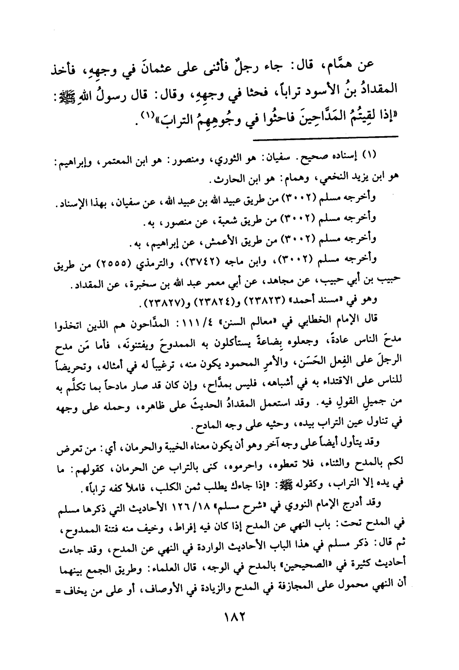 عن همَّام، قال: جاء رجلٌ فأثنى على عثمانَ في وجهِهِ، فأخذ المقدادُ بنُ الأسود تراباً، فحثا في وجهِهِ، وقال: قال رسولُ الله -صلى الله عليه وسلم-ِ: "إذا لقِيتُمُ المَدَّاحِينَ فاحثُوا في وجُوهِهِمُ الترابَ" (¬١).