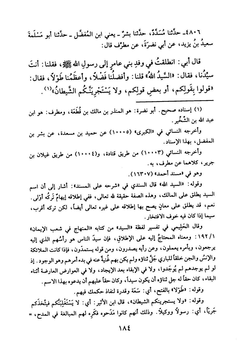 قال أبي: انطلقتُ في وفدِ بني عامرٍ إلى رسولِ الله -صلى الله عليه وسلم-، فقلنا: أنتَ سيّدُنا، فقال: "السَّيدُ الله" قلنا: وأفضلُنا فَضْلاً، وأعظَمُنا طَوْلاً، فقال: "قولوا بِقَولكم، أو بعضِ قولكم، ولا يَسْتَجْرِيَنَّكُم الشَيطانُ" (¬١).